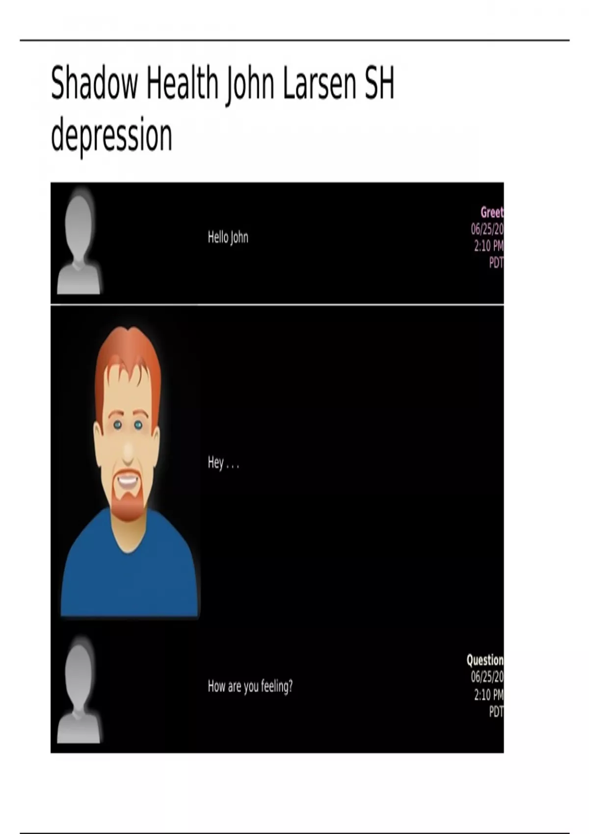 Hello John Greet 06/25/20 2:10 PM PDT Hey . . . How are you feeling? Question 06/25/20 2:10 PM PDT I wouldn't say I'm great. I'm in the hospital worrying about whatever the heck is causing these smothering sensations I've been having. I can see how troubled you are. We are here to help you Empathize 06/25/20 2:10 PM PDT Hey, thanks. What brought you into the hospital? Question 06/25/20 2:11 PM PDT I came in here early this morning feeling like I was being smothered, like I might be having a heart attack or something was going on with my blood pressure. It was this sort of . . . pressure in my chest. I guess the docs are chalking it up to panic, but it felt pretty damn real to me. Where was the chest pain located? Question 06/25/20 2:11 PM PDT I wouldn't call it pain exactly. It's something more like a slight pressure in my chest, like a smothering sensation. When did this chest pressure start? Question 06/25/20 2:11 PM PDT I've had some milder sensations like this over the past year or so, but it's been getting noticeably worse the past six months. It's never been as bad as it was this morning though -- those started around 3 AM. I guess theyre calling it panic, but I felt like I was having a heart attack. What triggers these episodes? (Clarified to What triggers your symptoms?.) Question 06/25/20 2:12 PM PDT It seems like it can happen any time of the day. There's no rhyme or reason to it. This morning it was particularly worrying. (Clarified to what triggers my symptoms.) CAn you describe these smothering sensations? Question 06/25/20 2:20 PM PDT I feel really keyed up. I start sweating, my heart races, my muscles feel tense, my breathing gets labored . . . Heck, even my vision gets blurry. Just thinking or talking about it kind of triggers it too. Do you have shortness of breath? (Clarified to Do you currently have shortness of breath?.) Question 06/25/20 2:20 PM PDT My breathing is fine right now. (Clarified to if I have shortness of breath right now.) Do you currently have any blurry vision? Question 06/25/20 2:22 PM PDT My vision did seem a bit blurry earlier this morning when I was having that smothering sensation. What makes the symptoms better? Question 06/25/20 2:27 PM PDT If I take some time to breathe -- really focus on the fact that I'm still breathing, that seems to help. Have you been unreasonably worried? Question 06/25/20 2:27 PM PDT I worry more now than I ever have. Mostly about work. There's always this looming threat of postal service cuts. I used to shrug off the idea, but as I get older, I can't help but dwell on the possibility. I can see how worrisome that can be. Job security is important Empathize 06/25/20 2:29 PM PDT Thank you. We will help you ease your anxiety and learn positive coping skills for when you feel an acute anxiety episode happen Empathize 06/25/20 2:33 PM PDT