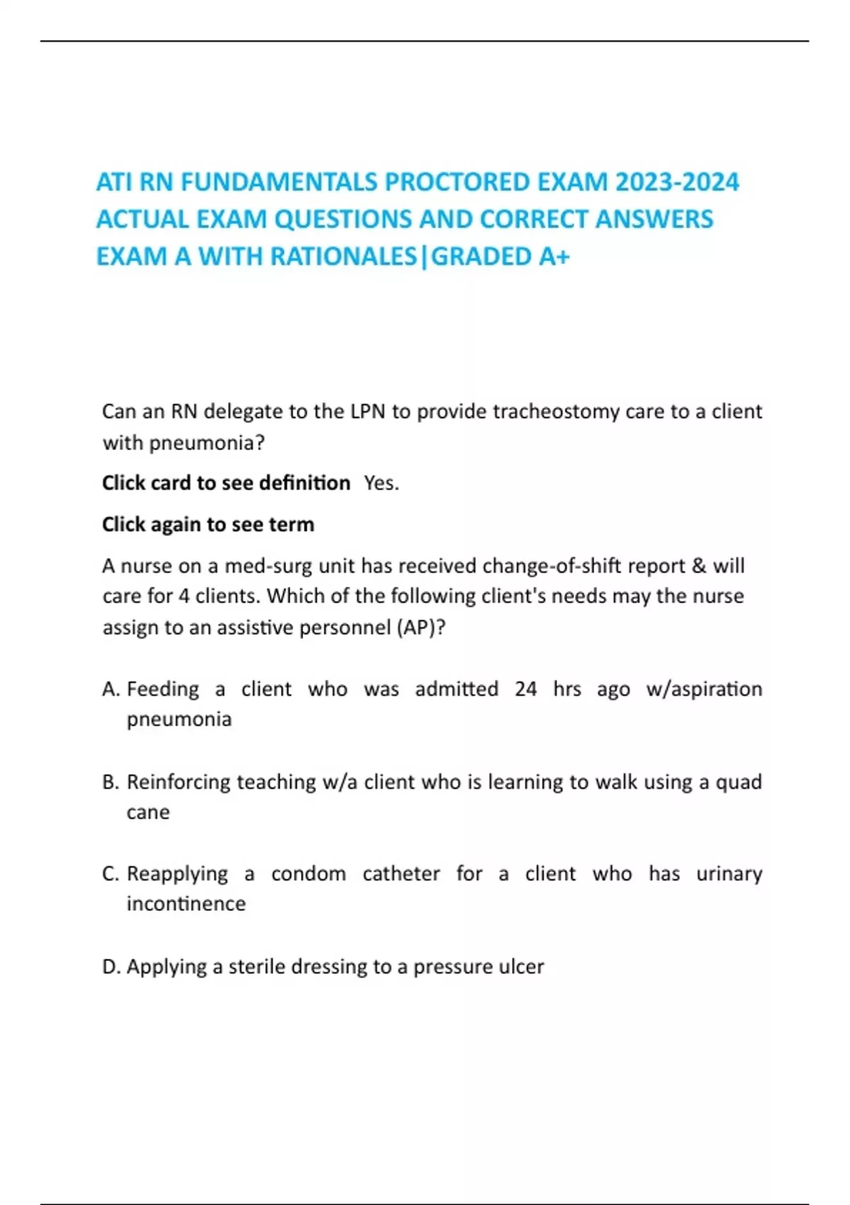 ATI RN FUNDAMENTALS PROCTORED EXAM ACTUAL EXAM QUESTIONS AND CORRECT ANSWERS EXAM A WITH RATIONALES|GRADED A+
