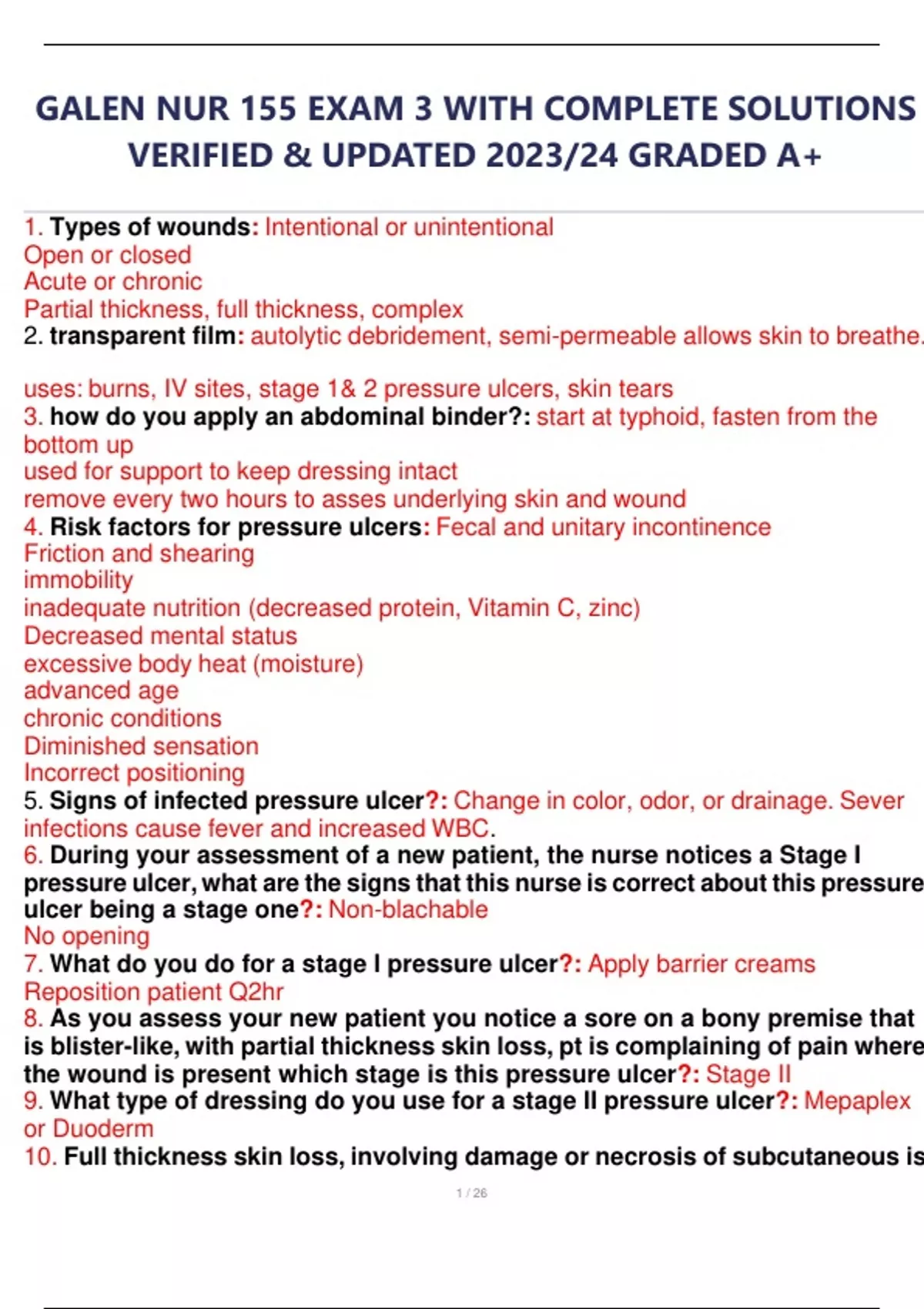 GALEN NUR 155 EXAM 3 WITH COMPLETE SOLUTIONS VERIFIED & UPDATED 2023/24 GRADED A+ 1. Types of wounds: Intentional or unintentional Open or closed Acute or chronic Partial thickness, full thickness, complex 2. transparent film: autolytic debridement, semi-permeable allows skin to breathe. uses: burns, IV sites, stage 1& 2 pressure ulcers, skin tears 3. how do you apply an abdominal binder?: start at typhoid, fasten from the bottom up used for support to keep dressing intact remove every two hours to asses underlying skin and wound