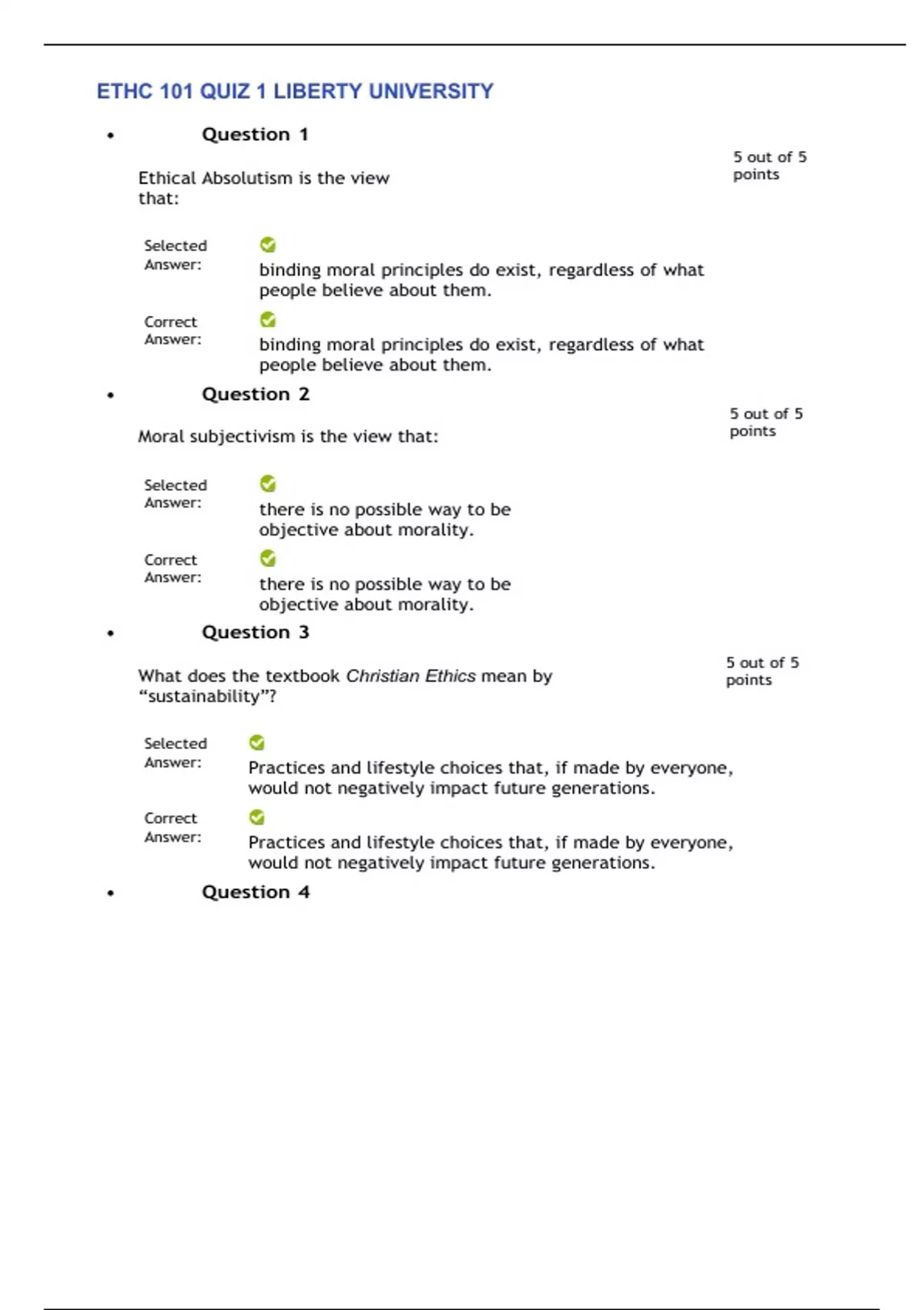 ETHC 101 QUIZ 1 LIBERTY UNIVERSITY • Question 1 Ethical Absolutism is the view that: 5 out of 5 points Selected Answer: binding moral principles do exist, regardless of what people believe about them. Correct Answer: binding moral principles do exist, regardless of what people believe about them. • Question 2 Moral subjectivism is the view that: Selected Answer: there is no possible way to be objective about morality. 5 out of 5 points Correct Answer: there is no possible way to be objective about morality. • Question 3 What does the textbook Christian Ethics mean by “sustainability”? 5 out of 5 points Selected Answer: Practices and lifestyle choices that, if made by everyone, would not negatively impact future generations. Correct Answer: Practices and lifestyle choices that, if made by everyone, would not negatively impact future generations. • Question 4