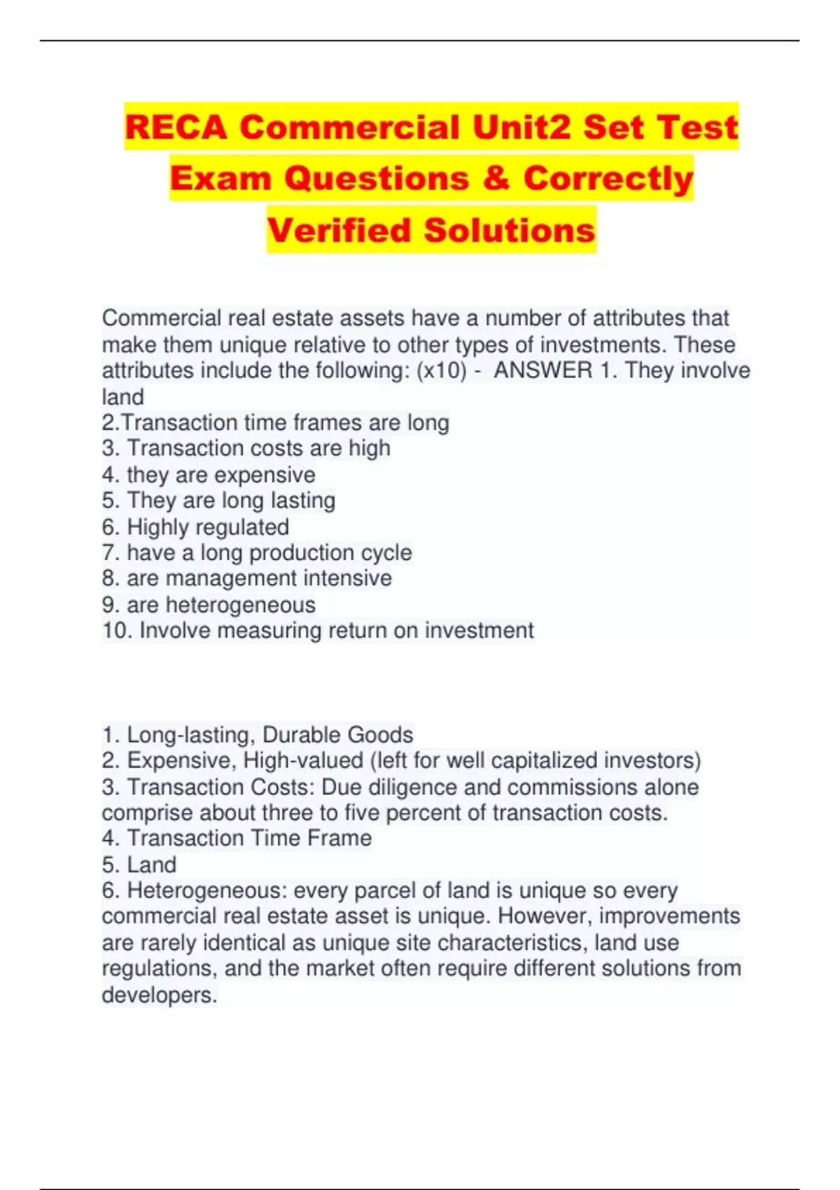 RECA Commercial Unit2 Set Test Exam Questions & Correctly Verified Solutions Commercial real estate assets have a number of attributes that make them unique relative to other types of investments. These attributes include the following: (x10) - ANSWER 1. They involve land 2.Transaction time frames are long 3. Transaction costs are high 4. they are expensive 5. They are long lasting 6. Highly regulated 7. have a long production cycle 8. are management intensive 9. are heterogeneous 10. Involve measuring return on investment 1. Long-lasting, Durable Goods 2. Expensive, High-valued (left for well capitalized investors) 3. Transaction Costs: Due diligence and commissions alone comprise about three to five percent of transaction costs. 4. Transaction Time Frame 5. Land 6. Heterogeneous: every parcel of land is unique so every commercial real estate asset is unique. However, improvements are rarely identical as unique site characteristics, land use regulations, and the market often require different solutions from developers. 7. Return Measures 8. Management Intensive 9. Long Production Cycle: it takes time to develop and construct new commercial real estate assets to meet the needs of the expanding population. This results in the real estate supply being relatively slow to respond to changes in demand (i.e. inelastic supply). 10. Highly Regulated Inelastic supply - ANSWER there is a limited supply. To illustrate, many cities are geographically constrained and have a Land Use Bylaw that limits the ability to change the use of a parcel of land. This results in a relatively inelastic supply of land for commercial purposes. Inelastic supply means the supply cannot readily adjust to changes in demand or price. four major commercial real estate asset product types according to Real Capital Analytics - ANSWER Office: Refers to real estate primarily used for office space