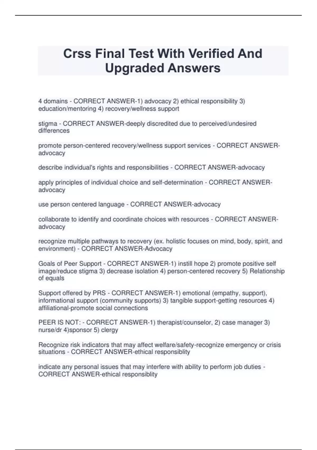 Crss Final Test With Verified And Upgraded Answers 4 domains - CORRECT ANSWER-1) advocacy 2) ethical responsibility 3) education/mentoring 4) recovery/wellness support stigma - CORRECT ANSWER-deeply discredited due to perceived/undesired differences promote person-centered recovery/wellness support services - CORRECT ANSWERadvocacy describe individual's rights and responsibilities - CORRECT ANSWER-advocacy apply principles of individual choice and self-determination - CORRECT ANSWERadvocacy use person centered language - CORRECT ANSWER-advocacy collaborate to identify and coordinate choices with resources - CORRECT ANSWERadvocacy recognize multiple pathways to recovery (ex. holistic focuses on mind, body, spirit, and environment) - CORRECT ANSWER-Advocacy Goals of Peer Support - CORRECT ANSWER-1) instill hope 2) promote positive self image/reduce stigma 3) decrease isolation 4) person-centered recovery 5) Relationship of equals Support offered by PRS - CORRECT ANSWER-1) emotional (empathy, support), informational support (community supports) 3) tangible support-getting resources 4) affiliational-promote social connections PEER IS NOT: - CORRECT ANSWER-1) therapist/counselor, 2) case manager 3) nurse/dr 4)sponsor 5) clergy Recognize risk indicators that may affect welfare/safety-recognize emergency or crisis situations - CORRECT ANSWER-ethical responsiblity