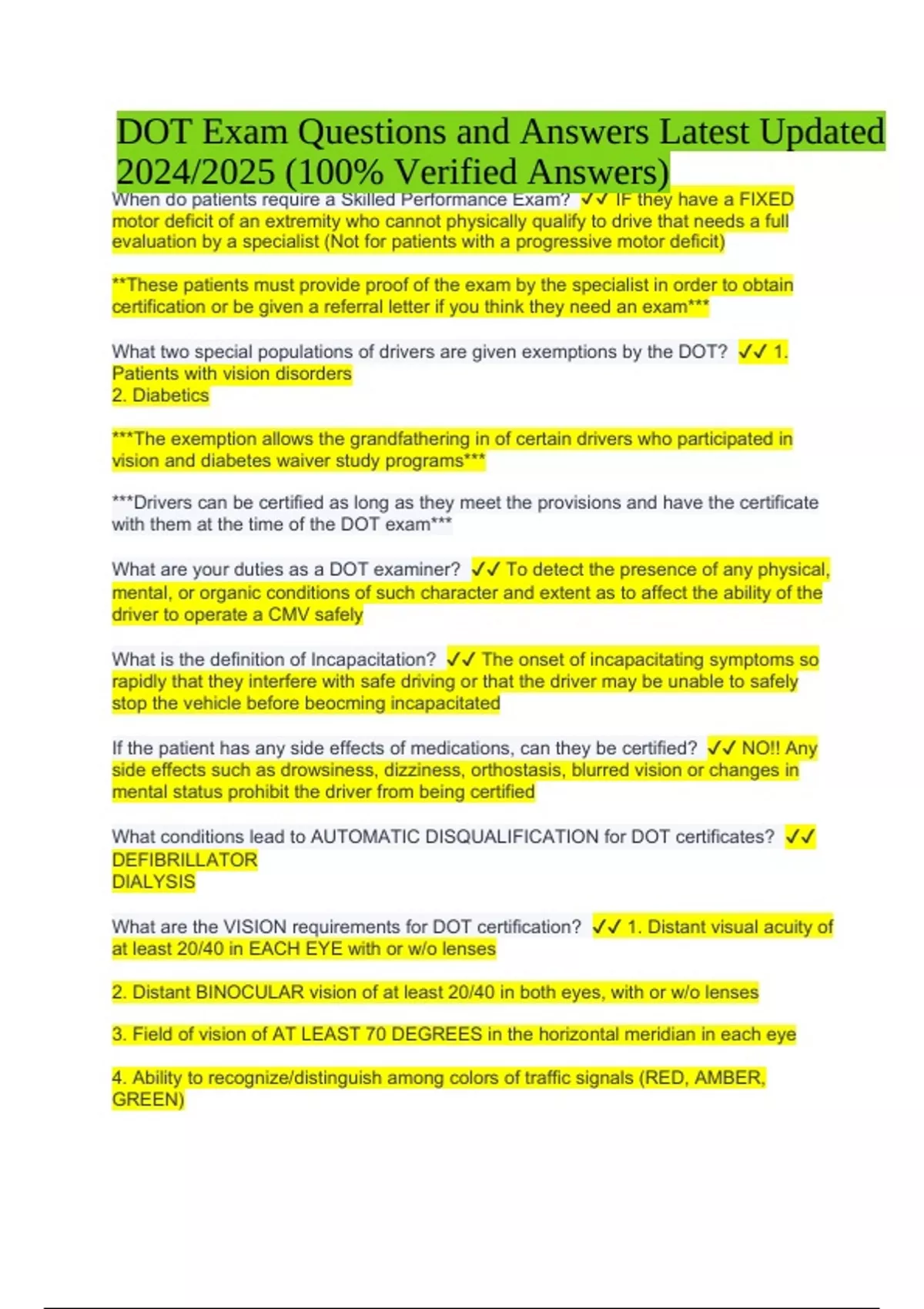 DOT Exam Questions and Answers Latest Updated 2024/2025 (100% Verified) When do patients require a Skilled Performance Exam? IF they have a FIXED motor deficit of an extremity who cannot physically qualify to drive that needs a full evaluation by a specialist (Not for patients with a progressive motor deficit) **These patients must provide proof of the exam by the specialist in order to obtain certification or be given a referral letter if you think they need an exam*** What two special populations of drivers are given exemptions by the DOT? 1. Patients with vision disorders 2. Diabetics ***The exemption allows the grandfathering in of certain drivers who participated in vision and diabetes waiver study programs*** ***Drivers can be certified as long as they meet the provisions and have the certificate with them at the time of the DOT exam*** What are your duties as a DOT examiner? To detect the presence of any physical, mental, or organic conditions of such character and extent as to affect the ability of the driver to operate a CMV safely What is the definition of Incapacitation? The onset of incapacitating symptoms so rapidly that they interfere with safe driving or that the driver may be unable to safely stop the vehicle before beocming incapacitated If the patient has any side effects of medications, can they be certified? NO!! Any side effects such as drowsiness, dizziness, orthostasis, blurred vision or changes in mental status prohibit the driver from being certified What conditions lead to AUTOMATIC DISQUALIFICATION for DOT certificates? DEFIBRILLATOR DIALYSIS What are the VISION requirements for DOT certification? 1. Distant visual acuity of at least 20/40 in EACH EYE with or w/o lenses 2. Distant BINOCULAR vision of at least 20/40 in both eyes, with or w/o lenses 3. Field of vision of AT LEAST 70 DEGREES in the horizontal meridian in each eye 4. Ability to recognize/distinguish among colors of traffic signals (RED, AMBER, GREEN) DOT Exam Questions and Answers Latest Updated 2024/2025 (100% Verified Answers) Can a driver with monocular vision obtain a DOT certificate? YES, but the driver must be otherwise medically fit for duty and granted a FEDERAL VISION EXEMPTION CERTIFICATE **Pt must return with the certificate of exemption before the DOT certificate can be given*** If a driver comes for a physical and is otherwise fit, you can disqualify them and the driver can apply for a federal vision exemption What is MONOCULAR VISION? Monocular vision occurs when the vision requirements are only met in one eye, with or without corrective lenses ***MONOCULAR VISION IS AUTOMATICALLY DISQUALIFYING*** How do you certify a driver who is in the process of applying for a Federal vision exemption? YOu can certify the driver for up to 1 year, mark the accompanied by EXEMPTION checkbox and write vision so that the type of federal exemption is specified What are the hearing requirements to obtain a DOT certificate? 1. Driver must first perceive a whispered voice in one ear @ no less than 5 feet (only required in 1 ear) 2. NOT have an average hearing loss in one ear >40dB at 500 Hz, 1,000 Hz and 2,000 Hz What are the BP regulations for a person with STAGE 1 HTN (BP of 140/90-159/99)? person is only certified for 1 year and if BP is >140/90 then they get 3 month cert at the 1 year recert What are the BP regulations for a perston with STAGE 2 HTN (BP of 160/100 to 180/110? Person can only get a 3 month certificate and then at recertification if the BP is less than 140/90, they can get 1 year from the date of the original exam What are the DOT regulations for a driver with STAGE 3 HTN (BP>180/110)? DRIVER IS DISQUALIFIED until the BP is <140/90 When BP is <140/90, they can only get a 6 month certificate forever What does a urinalysis check for DOT certification? Specific gravity Proteinuria Hematuria Glycosuria What should the PE rule out in every driver? Presence of any current CV disease accompanied by and/or likely to cause symptoms of syncope, dyspnea, collapse or CHF How long must a driver wait to be certified after having an AMI? There is a 2 months waiting period so driver is temporarily disqualified for 2 months and can only be certified for a max of 1 year if they are Asx, tolerating meds, has a satisfactory Exercise Tolerance test has resting EF >40% and no ischemic changes on EKG ***For the initial certification exam following an MI, an in-hospital post-MI echo showing LV EF>40% is sufficient*** What LV EF is required after an MI for a patient to obtain DOT certificate? LV EF>40%