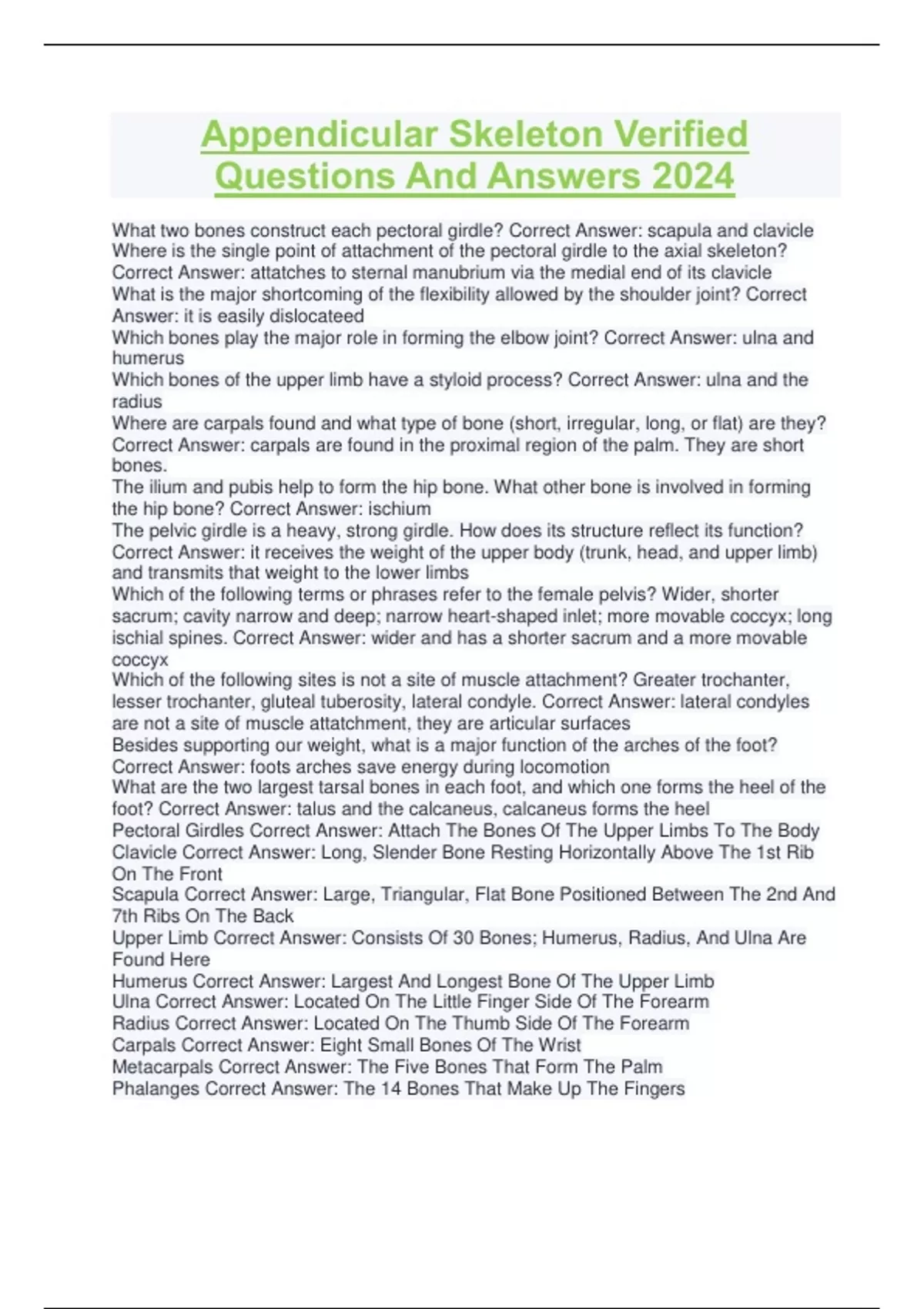 Appendicular Skeleton Verified Questions And Answers 2024 Appendicular Skeleton Verified Questions And Answers 2024