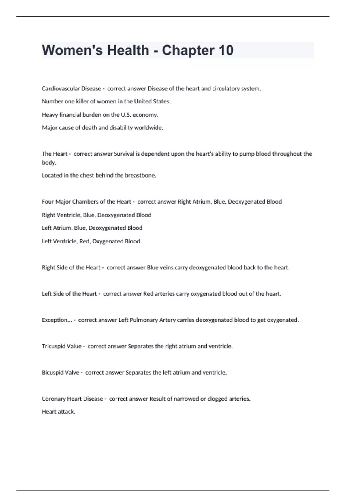 Women's Health - Chapter 10Cardiovascular Disease - correct answer Disease of the heart and circulatory system. Number one killer of women in the United States. Heavy financial burden on the U.S. economy. Major cause of death and disability worldwide. The Heart - correct answer Survival is dependent upon the heart's ability to pump blood throughout the body. Located in the chest behind the breastbone. Four Major Chambers of the Heart - correct answer Right Atrium, Blue, Deoxygenated Blood Right Ventricle, Blue, Deoxygenated Blood Left Atrium, Blue, Deoxygenated Blood Left Ventricle, Red, Oxygenated Blood Right Side of the Heart - correct answer Blue veins carry deoxygenated blood back to the heart. Left Side of the Heart - correct answer Red arteries carry oxygenated blood out of the heart. Exception... - correct answer Left Pulmonary Artery carries deoxygenated blood to get oxygenated. Tricuspid Value - correct answer Separates the right atrium and ventricle. Bicuspid Valve - correct answer Separates the left atrium and ventricle. Coronary Heart Disease - correct answer Result of narrowed or clogged arteries. Heart attack.