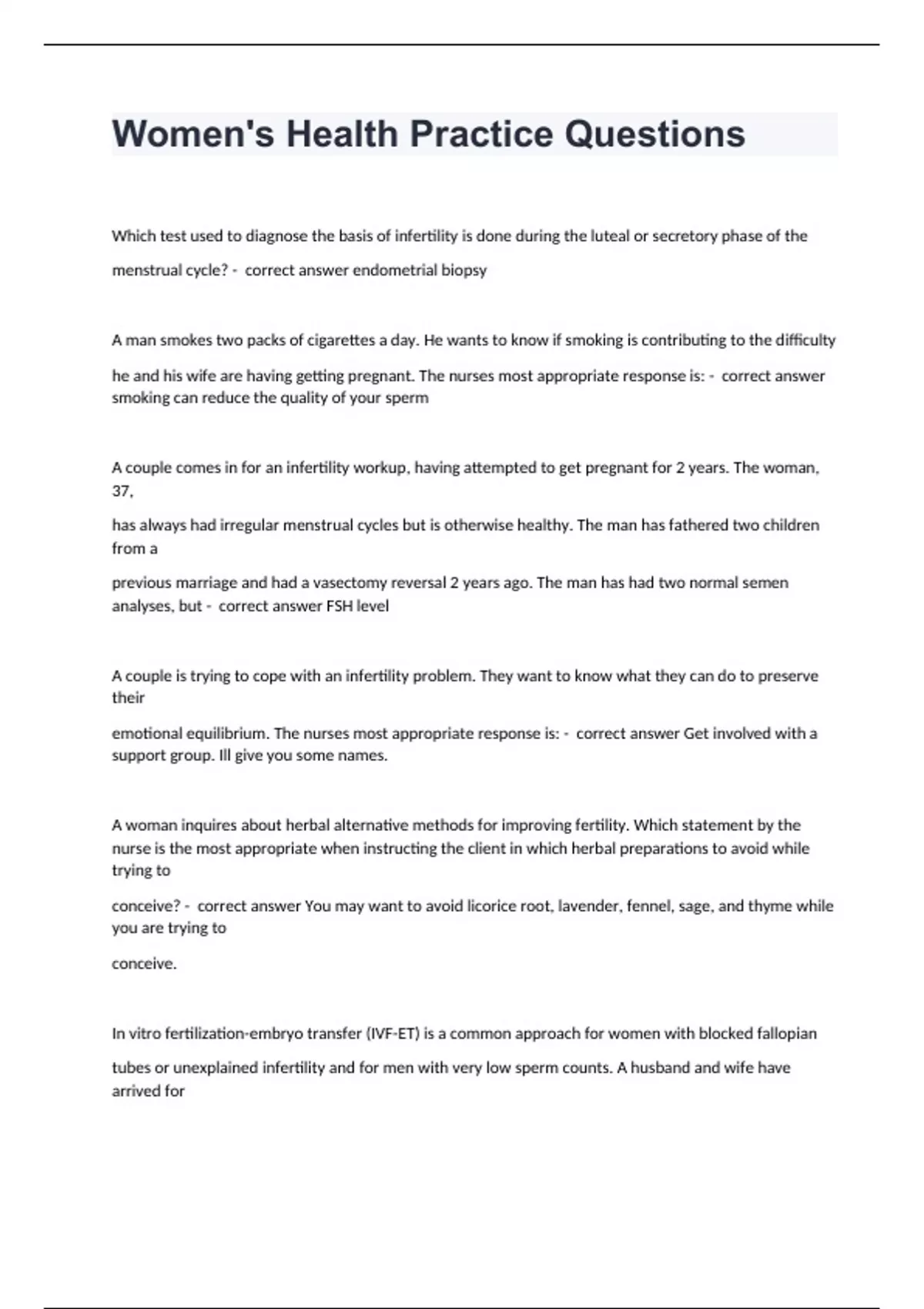 Women's Gynecologic Health Which test used to diagnose the basis of infertility is done during the luteal or secretory phase of the menstrual cycle? - correct answer endometrial biopsy A man smokes two packs of cigarettes a day. He wants to know if smoking is contributing to the difficulty he and his wife are having getting pregnant. The nurses most appropriate response is: - correct answer smoking can reduce the quality of your sperm A couple comes in for an infertility workup, having attempted to get pregnant for 2 years. The woman, 37, has always had irregular menstrual cycles but is otherwise healthy. The man has fathered two children from a previous marriage and had a vasectomy reversal 2 years ago. The man has had two normal semen analyses, but - correct answer FSH level A couple is trying to cope with an infertility problem. They want to know what they can do to preserve their emotional equilibrium. The nurses most appropriate response is: - correct answer Get involved with a support group. Ill give you some names. A woman inquires about herbal alternative methods for improving fertility. Which statement by the nurse is the most appropriate when instructing the client in which herbal preparations to avoid while trying to conceive? - correct answer You may want to avoid licorice root, lavender, fennel, sage, and thyme while you are trying to conceive. In vitro fertilization-embryo transfer (IVF-ET) is a common approach for women with blocked fallopian tubes or unexplained infertility and for men with very low sperm counts. A husband and wife have arrived for their preprocedural interview. The husband asks the nurse to explain what the procedure entails. The nurses most appropriate response is: - correct answer IVF-ET is a type of assisted reproductive therapy that involves collecting eggs from your wifes ovaries, fertilizing them in the laboratory with your sperm, and transferring the embryo to her uterus. Nurses should be aware that infertility: - correct answer Is perceived differently by women and men. With regard to the assessment of female, male, and couple infertility, nurses should be aware that: - correct answer The investigation takes 3-4 months and a significant financial investment In their role of implementing a plan of care for infertile couples, nurses should: - correct answer Do all of the above plus be knowledgeable about potential drug and surgical remedies. Although remarkable developments have occurred in reproductive medicine, assisted reproductive therapies are associated with numerous legal and ethical issues. Nurses can provide accurate information about the risks and benefits of treatment alternatives so couples can make informed decisions about their choice of treatment. Which issue would not need to be addressed by an infertile couple before treatment? - correct answer Financial ability to cover the cost of treatment A woman has chosen the calendar method of conception control. During the assessment process, it is most important that the nurse: - correct answer Obtain a history of menstrual cycle lengths for the past 6-12 months A woman is using the basal body temperature (BBT) method of contraception. She calls the clinic and tells