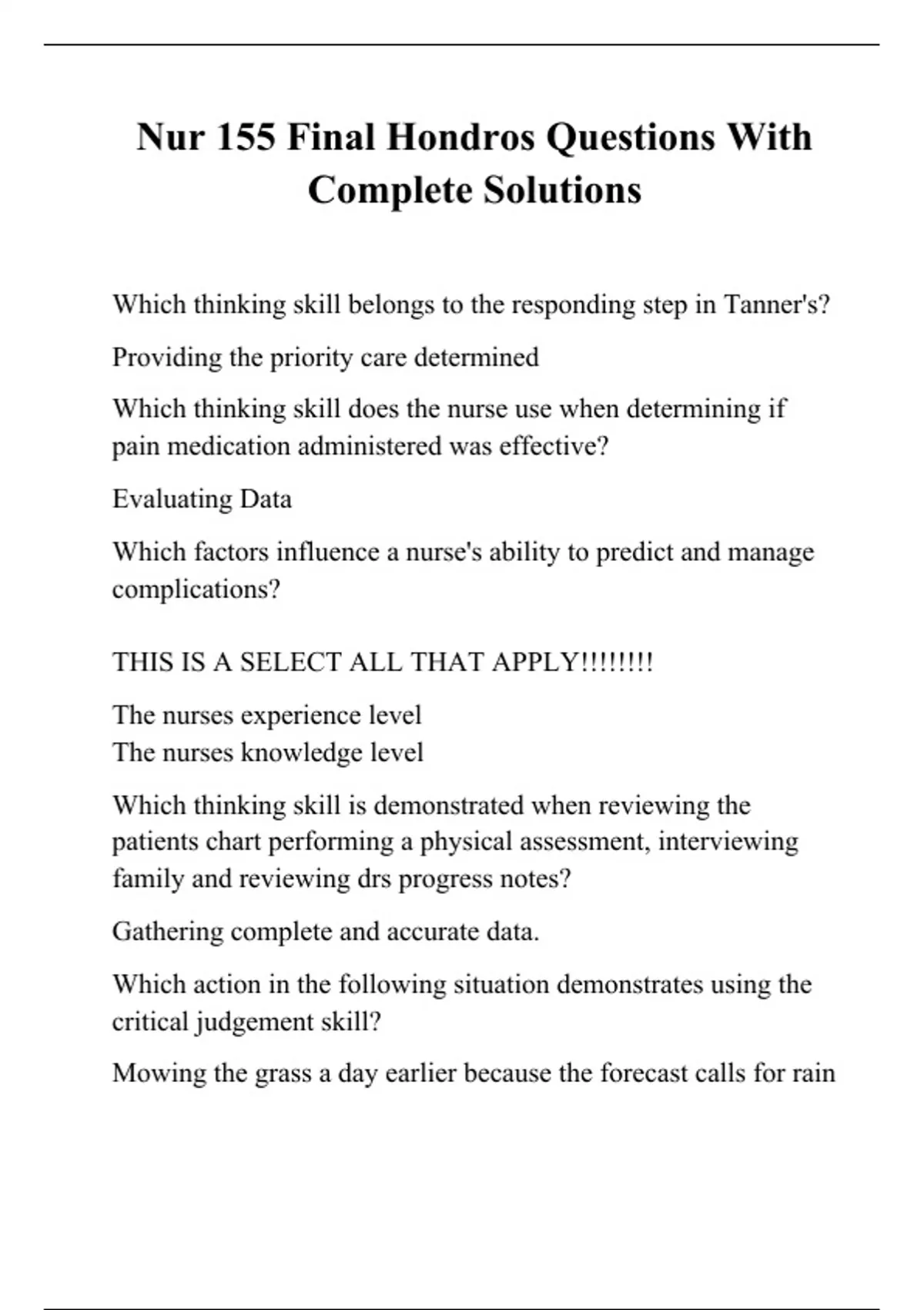 Nur 155 Final Hondros Questions With Complete Solutions