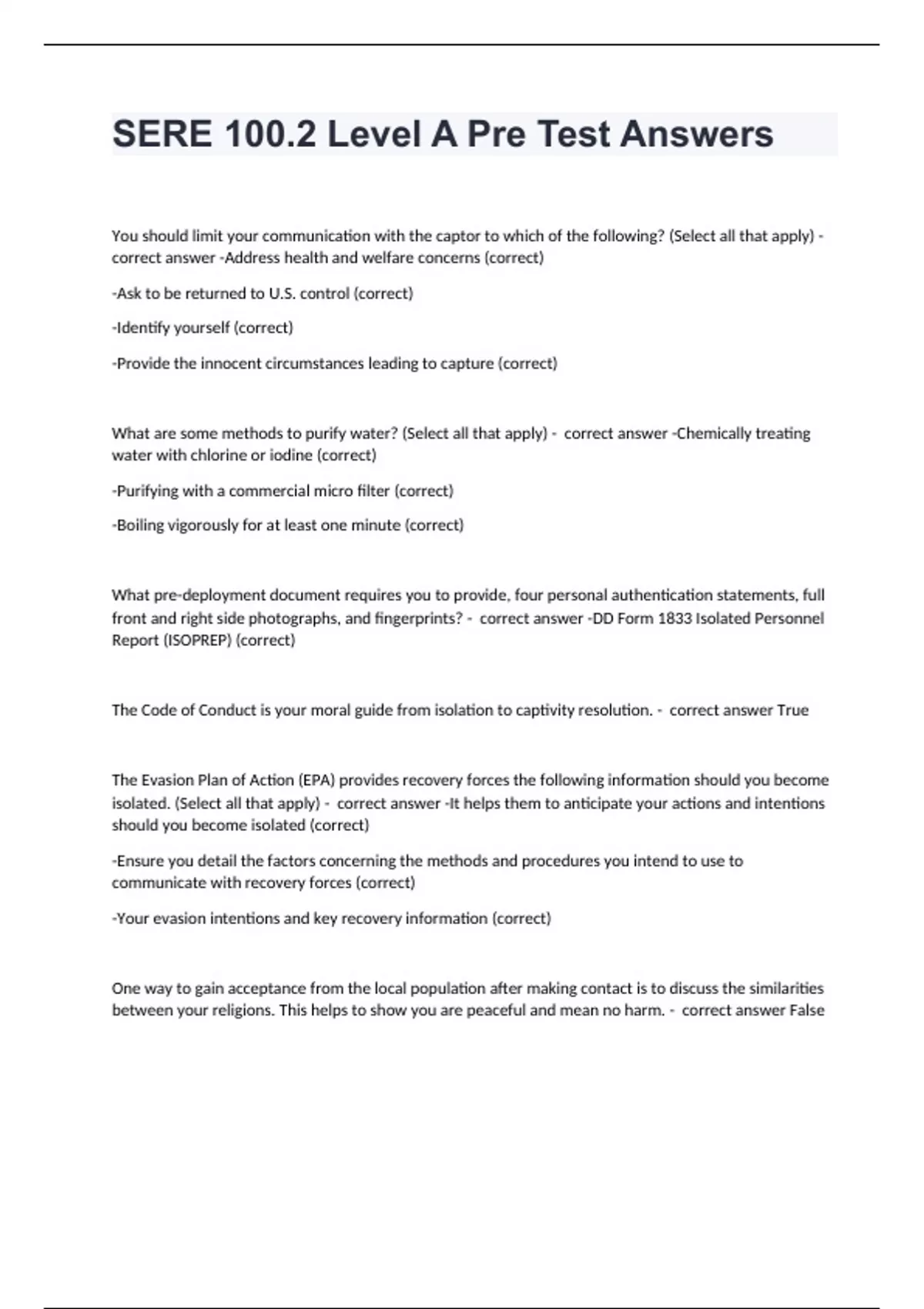 SERE 100.2 Level A Pre Test Answers Question and answers 2024 verified to pass You should limit your communication with the captor to which of the following? (Select all that apply) - correct answer -Address health and welfare concerns (correct) -Ask to be returned to U.S. control (correct) -Identify yourself (correct) -Provide the innocent circumstances leading to capture (correct) What are some methods to purify water? (Select all that apply) - correct answer -Chemically treating water with chlorine or iodine (correct) -Purifying with a commercial micro filter (correct) -Boiling vigorously for at least one minute (correct) What pre-deployment document requires you to provide, four personal authentication statements, full front and right side photographs, and fingerprints? - correct answer -DD Form 1833 Isolated Personnel Report (ISOPREP) (correct) The Code of Conduct is your moral guide from isolation to captivity resolution. - correct answer True The Evasion Plan of Action (EPA) provides recovery forces the following information should you become isolated. (Select all that apply) - correct answer -It helps them to anticipate your actions and intentions should you bec
