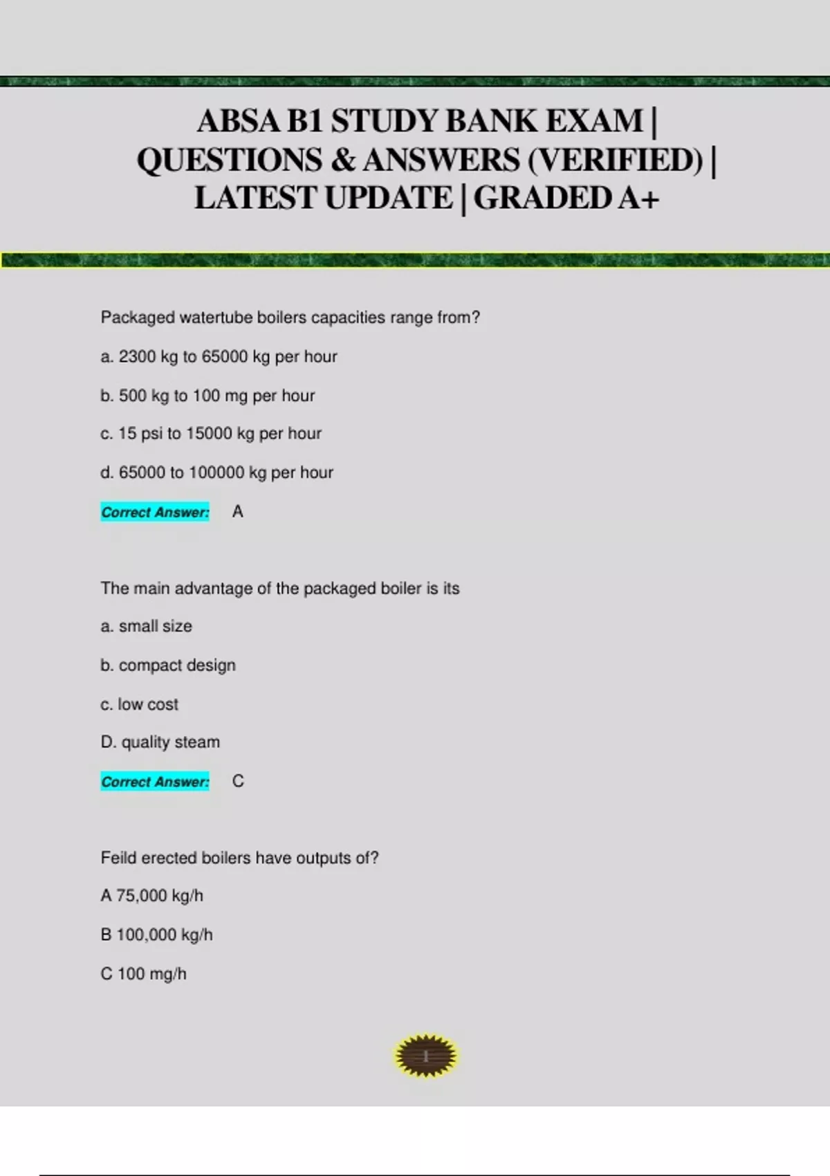 ABSA B1 STUDY BANK EXAM | QUESTIONS & ANSWERS (VERIFIED) | LATEST UPDATE | GRADED A+ Packaged watertube boilers capacities range from? a. 2300 kg to 65000 kg per hour b. 500 kg to 100 mg per hour c. 15 psi to 15000 kg per hour d. 65000 to 100000 kg per hour Correct Answer: A The main advantage of the packaged boiler is its a. small size b. compact design c. low cost D. quality steam Correct Answer: C Feild erected boilers have outputs of? A 75,000 kg/h B 100,000 kg/h C 100 mg/h 2 D 150,000 kg/h or more Correct Answer: D Where electric power is used as a heating source, the boiler rating shall be the maximum kilowatt rating of the A Power plant B Heating element C Boiler wiring D MCC Correct Answer: B The down cameras are located in the _______ regions of the boiler, or external to the furnace all together. The risers are located in the_______zones of the boiler being exposed to radiant heat of the furnace or very hot flu gases near the furnace A Back, front B Cooler, hottest C Water, furnace D Drum, radiant Correct Answer: B