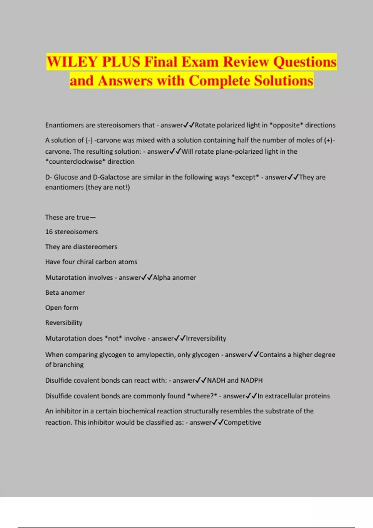 WILEY PLUS Final Exam Review Questions and Answers with Complete Solutions Enantiomers are stereoisomers that - answerRotate polarized light in *opposite* directions A solution of (-) -carvone was mixed with a solution containing half the number of moles of (+)- carvone. The resulting solution: - answerWill rotate plane-polarized light in the *counterclockwise* direction D- Glucose and D-Galactose are similar in the following ways *except* - answerThey are enantiomers (they are not!) These are true— 16 stereoisomers They are diastereomers Have four chiral carbon atoms Mutarotation involves - answerAlpha anomer Beta anomer Open form Reversibility Mutarotation does *not* involve - answerIrreversibility When comparing glycogen to amylopectin, only glycogen - answerContains a higher degree of branching Disulfide covalent bonds can react with: - answerNADH and NADPH Disulfide covalent bonds are commonly found *where?* - answerIn extracellular proteins An inhibitor in a certain biochemical reaction structurally resembles the substrate of the reaction. This inhibitor would be classified as: - answerCompetitive
