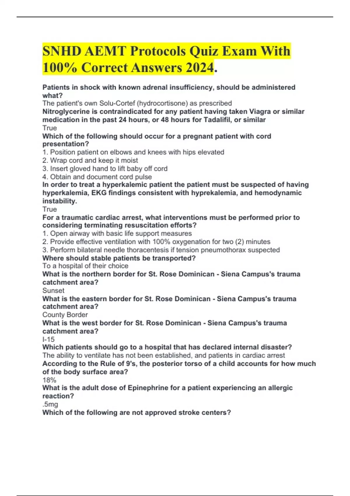 SNHD AEMT Protocols Quiz Exam With 100% Correct Answers 2024. Patients in shock with known adrenal insufficiency, should be administered what? The patient's own Solu-Cortef (hydrocortisone) as prescribed Nitroglycerine is contraindicated for any patient having taken Viagra or similar medication in the past 24 hours, or 48 hours for Tadalifil, or similar True Which of the following should occur for a pregnant patient with cord presentation? 1. Position patient on elbows and knees with hips elevated 2. Wrap cord and keep it moist 3. Insert gloved hand to lift baby off cord 4. Obtain and document cord pulse In order to treat a hyperkalemic patient the patient must be suspected of having hyperkalemia, EKG findings consistent with hyprekalemia, and hemodynamic instability. True For a traumatic cardiac arrest, what interventions must be performed prior to considering terminating resuscitation efforts? 1. Open airway with basic life support measures 2. Provide effective ventilation with 100% oxygenation for two (2) minutes 3. Perform bilateral needle thoracentesis if tension pneumothorax suspected Where should stable patients be transported? To a hospital of their choice What is the northern border for St. Rose Dominican - Siena Campus's trauma catchment area? Sunset What is the eastern border for St. Rose Dominican - Siena Campus's trauma catchment area? County Border What is the west border for St. Rose Dominican - Siena Campus's trauma catchment area? I-15 Which patients should go to a hospital that has declared internal disaster? The ability to ventilate has not been established, and patients in cardiac arrest According to the Rule of 9's, the posterior torso of a child accounts for how much of the body surface area? 18% What is the adult dose of Epinephrine for a patient experiencing an allergic reaction? .5mg Which of the following are not approved stroke centers? Mesa View Boulder City Hospital North Vista Severe hypothermia is? 82°F Moderate hypothermia is? 82°F-90°F Mild hypothermia is? 90°F-95°F According to the Rule of 9's, the head of a child accounts for how much of the body surface area? 18% According to the Rule of 9's, a single arm of a child accounts for how much of the body surface area? 9% According to the pediatric trauma assessment protocol, what is the pediatric fluid bolus? 20 ml/kg A mild allergic reaction involves skin rashes, itchy sensation, or hives with no respiratory involvement True Patients evidence of a stroke shall be transported in accordance with the: Stroke Protocol What is the total dose of Naloxone for a pediatric patient who is unresponsive with respiratory depression and a suspected narcotic overdose? 10 mg What are causes of adrenal insufficiency? Long term administration of steroids Congenital adrenal hyperplasia Addison's disease What is the compression to ventilation ratio for neonatal resuscitation? 3:1 Which of the following are presumptive signs of death? Pulselessness Unresponsiveness Apnea Fixed, dilated pupils Which of the following are obvious signs of death? Body decomposition Decapitation Transection of thorax (hemicorpectomy) Incineration Which of the following are conclusive signs of death? Dependent lividity of any degree Rigor mortis Massive trauma to the head, neck or chest with visible organ destruction