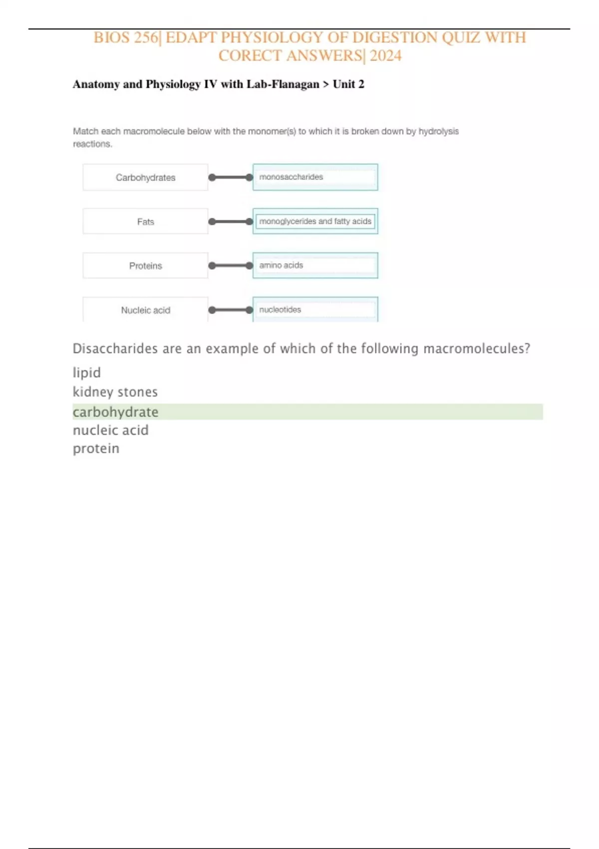 BIOS 256| EDAPT PHYSIOLOGY OF DIGESTION QUIZ WITH CORECT ANSWERS| 2024