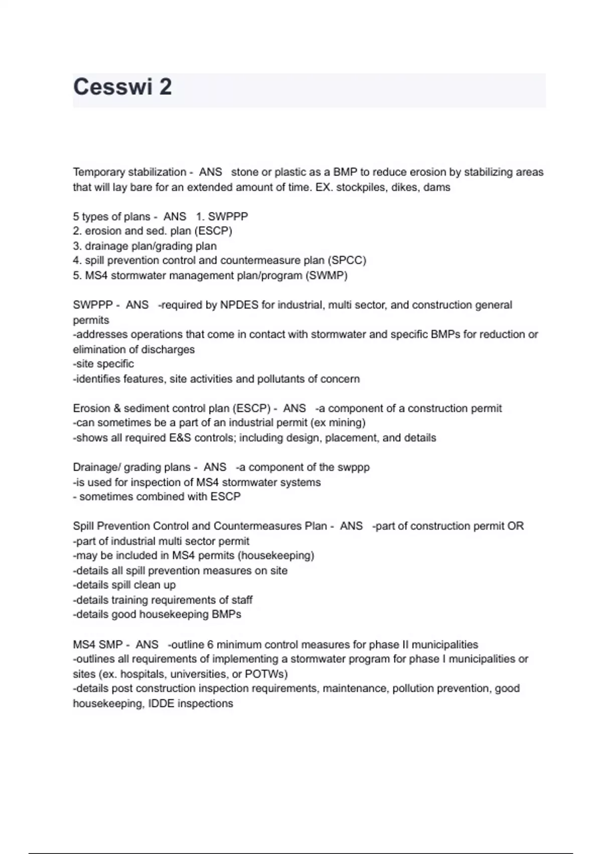 CESSWI Exam Questions And Answers Temporary stabilization - ANS stone or plastic as a BMP to reduce erosion by stabilizing areas that will lay bare for an extended amount of time. EX. stockpiles, dikes, dams 5 types of plans - ANS 1. SWPPP 2. erosion and sed. plan (ESCP) 3. drainage plan/grading plan 4. spill prevention control and countermeasure plan (SPCC) 5. MS4 stormwater management plan/program (SWMP) SWPPP - ANS -required by NPDES for industrial, multi sector, and construction general permits -addresses operations that come in contact with stormwater and specific BMPs for reduction or elimination of discharges -site specific -identifies features, site activities and pollutants of concern Erosion & sediment control plan (ESCP) - ANS -a component of a construction permit -can sometimes be a part of an industrial permit (ex mining) -shows all required E&S controls; including design, placement, and details Drainage/ grading plans - ANS -a component of the swppp -is used for inspection of MS4 stormwater systems - sometimes combined with ESCP Spill Prevention Control and Countermeasures Plan - ANS -part of construction permit OR -part of industrial multi sector permit -may be included in MS4 permits (housekeeping) -details all spill prevention measures on site -details spill clean up -details training requirements of staff -details good housekeeping BMPs MS4 SMP - ANS -outline 6 minimum control measures for phase II municipalities -outlines all requirements of implementing a stormwater program for phase I municipalities or sites (ex. hospitals, universities, or POTWs) -details post construction inspection requirements, maintenance, pollution prevention, good housekeeping, IDDE inspections components of a plan - ANS -table of conten