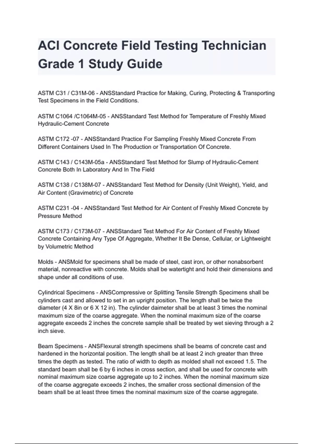 ACI Concrete Field Testing Technician Grade 1 Study Guide 2024/2025 A+ score assured ( 100% verified)