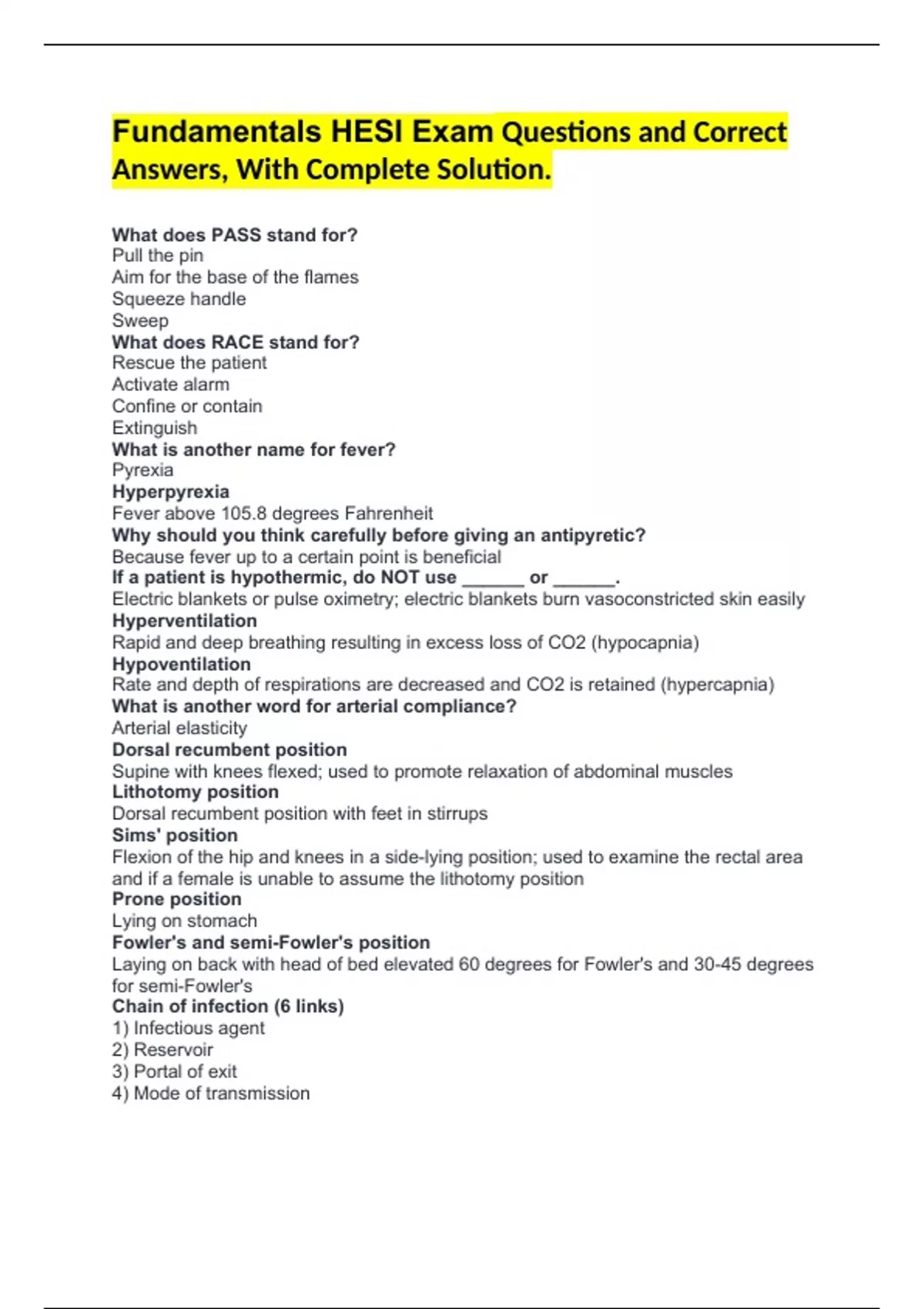 Fundamentals HESI Exam Questions and Correct Answers, With Complete Solution. What does PASS stand for? Pull the pin Aim for the base of the flames Squeeze handle Sweep What does RACE stand for? Rescue the patient Activate alarm Confine or contain Extinguish What is another name for fever? Pyrexia Hyperpyrexia Fever above 105.8 degrees Fahrenheit Why should you think carefully before giving an antipyretic? Because fever up to a certain point is beneficial If a patient is hypothermic, do NOT use ______ or ______. Electric blankets or pulse oximetry; electric blankets burn vasoconstricted skin easily Hyperventilation Rapid and deep breathing resulting in excess loss of CO2 (hypocapnia) Hypoventilation Rate and depth of respirations are decreased and CO2 is retained (hypercapnia) What is another word for arterial compliance? Arterial elasticity Dorsal recumbent position Supine with knees flexed; used to promote relaxation of abdominal muscles Lithotomy position Dorsal recumbent position with feet in stirrups Sims' position Flexion of the hip and knees in a side-lying position; used to examine the rectal area and if a female is unable to assume the lithotomy position Prone position Lying on stomach Fowler's and semi-Fowler's position Laying on back with head of bed elevated 60 degrees for Fowler's and 30-45 degrees for semi-Fowler's Chain of infection (6 links) 1) Infectious agent 2) Reservoir 3) Portal of exit 4) Mode of transmission