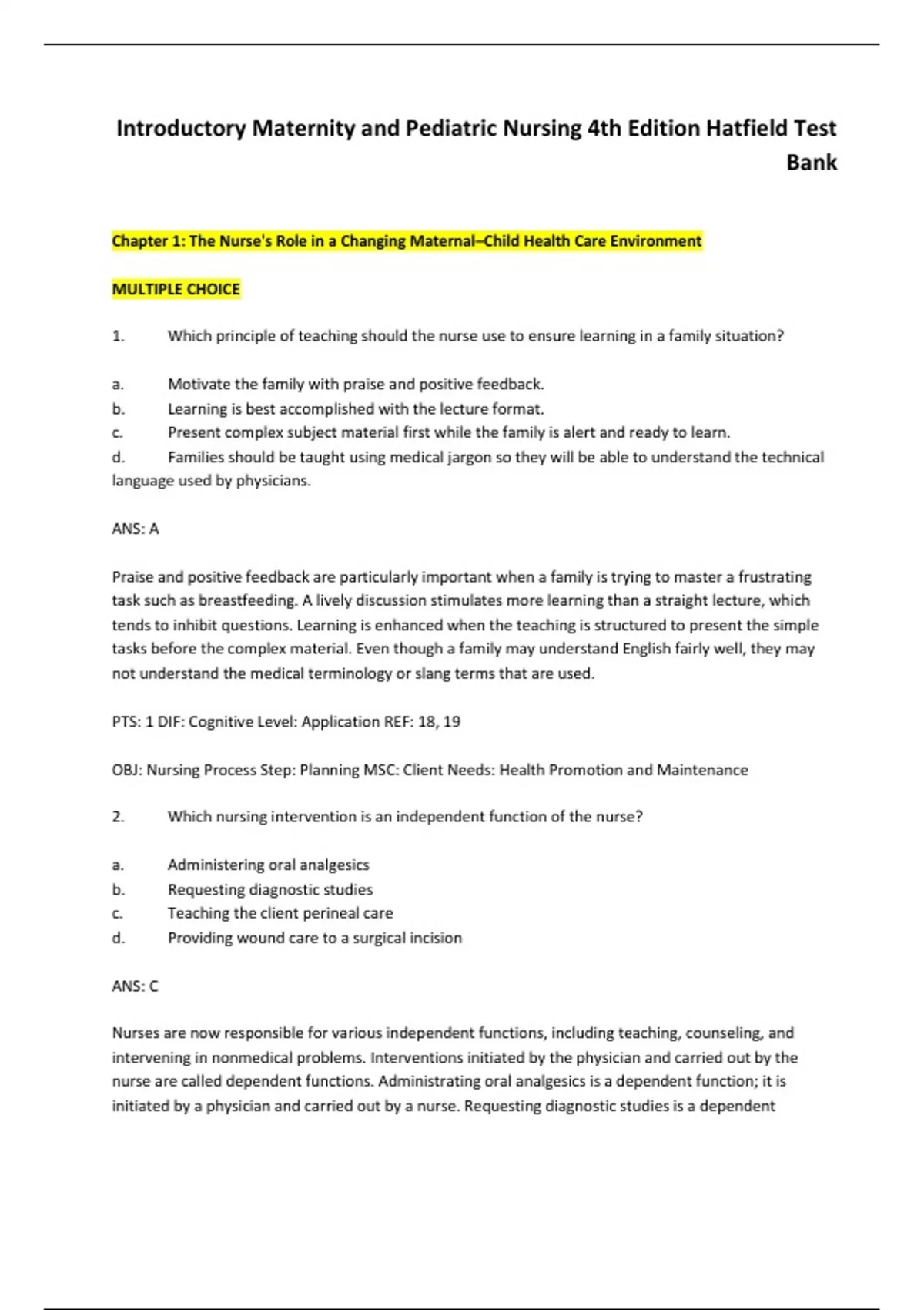 Introductory Maternity and Pediatric Nursing 4th Edition Hatfield Test Bank Chapter 1: The Nurse's Role in a Changing Maternal–Child Health Care Environment MULTIPLE CHOICE 1. Which principle of teaching should the nurse use to ensure learning in a family situation? a. Motivate the family with praise and positive feedback. b. Learning is best accomplished with the lecture format. c. Present complex subject material first while the family is alert and ready to learn. d. Families should be taught using medical jargon so they will be able to understand the technical language used by physicians. ANS: A Praise and positive feedback are particularly important when a family is trying to master a frustrating task such as breastfeeding. A lively discussion stimulates more learning than a straight lecture, which tends to inhibit questions. Learning is enhanced when the teaching is structured to present the simple tasks before the complex material. Even though a family may understand English fairly well, they may not understand the medical terminology or slang terms that are used. PTS: 1 DIF: Cognitive Level: Application REF: 18, 19 OBJ: Nursing Process Step: Planning MSC: Client Needs: Health Promotion and Maintenance 2. Which nursing intervention is an independent function of the nurse? a. Administering oral analgesics b. Requesting diagnostic studies c. Teaching the client perineal care d. Providing wound care to a surgical incision ANS: C Nurses are now responsible for various independent functions, including teaching, counseling, and intervening in nonmedical problems. Interventions initiated by the physician and carried out by the nurse are called dependent functions. Administrating oral analgesics is a dependent function; it is initiated by a physician and carried out by a nurse. Requesting diagnostic studies is a dependent function. Providing wound care is a dependent function; it is usually initiated by the physician through direct orders or protocol. PTS: 1 DIF: Cognitive Level: Understanding REF: 24 OBJ: Nursing Process Step: Assessment MSC: Client Needs: Safe and Effective Care Environment 3. Which most therapeutic response to the clients statement, Im afraid to have a cesarean birth should be made by the nurse? a. Everything will be OK. b. Dont worry about it. It will be over soon. c. What concerns you most about a cesarean birth? d. The physician will be in later and you can talk to him. ANS: C The response, What concerns you most about a cesarean birth focuses on what the client is saying and asks for clarification, which is the most therapeutic response. The response, Everything will be ok is belittling the clients feelings. The response, Dont worry about it. It will be over soon will indicate that the clients feelings are not important. The response, The physician will be in later and you can talk to him does not allow the client to verbalize her feelings when she wishes to do that. PTS: 1 DIF: Cognitive Level: Application REF: 18 OBJ: Nursing Process Step: Implementation MSC: Client Needs: Psychosocial Integrity 4. Which action should the nurse take to evaluate the clients learning about performing infant care? a. Demonstrate infant care procedures. b. Allow the client to verbalize the procedure. c. Routinely assess the infant for cleanliness. d. Observe the client as she performs the procedure. ANS: D The clients correct performance of the procedure under the nurses supervision is the best proof of her ability. Demonstration is an excellent teaching method, but not an evaluation method. During verbalization of the procedure, the nurse may not pick up on techniques that are incorrect. It is not the best tool for evaluation. Routinely assessing the infant for cleanliness will not ensure that the proper procedure is carried out. The nurse may miss seeing that unsafe techniques being used. PTS: 1 DIF: Cognitive Level: Application REF: 21 OBJ: Nursing Process Step: Evaluation MSC: Client Needs: Health Promotion and Maintenance 5. A nurse is reviewing teaching and learning principles. Which situation is most conducive to learning? a. An auditorium is being used as a classroom for 300 students. b. A teacher who speaks very little Spanish is teaching a class of Hispanic students. c. A class is composed of students of various ages and educational backgrounds. d. An Asian nurse provides nutritional information to a group of pregnant Asian women. ANS: D A clients culture influences the learning process; thus, a situation that is most conducive to learning is one in which the teacher has knowledge and understanding of the clients cultural beliefs. A large class is not conducive to learning. It does not allow questions, and the teacher cannot see nonverbal cues from the students to ensure understanding. The ability to understand the language in which teaching is done determines how much the client learns. Clients for whom English is not their primary language may not understand idioms, nuances, slang terms, informed usage of words, or medical terms. The teacher should be fluent in the language of the student. Developmental levels and educational levels influence how a person learns best. For the teacher to present the information in the best way, the class should be at the same level. PTS: 1 DIF: Cognitive Level: Application REF: 20 OBJ: Nursing Process Step: Planning MSC: Client Needs: Psychosocial Integrity 6. Which is the step of the nursing process in which the nurse determines the appropriate interventions for the identified nursing diagnosis? a. Planning b. Evaluation c. Assessment d. Intervention ANS: A The third step in the nursing process involves planning care for problems that were identified during assessment. The evaluation phase is determining whether the goals have been met. During the assessment phase, data are collected. The intervention phase is when the plan of care is carried out. PTS: 1 DIF: Cognitive Level: Understanding REF: 24 OBJ: Nursing Process Step: Planning MSC:
