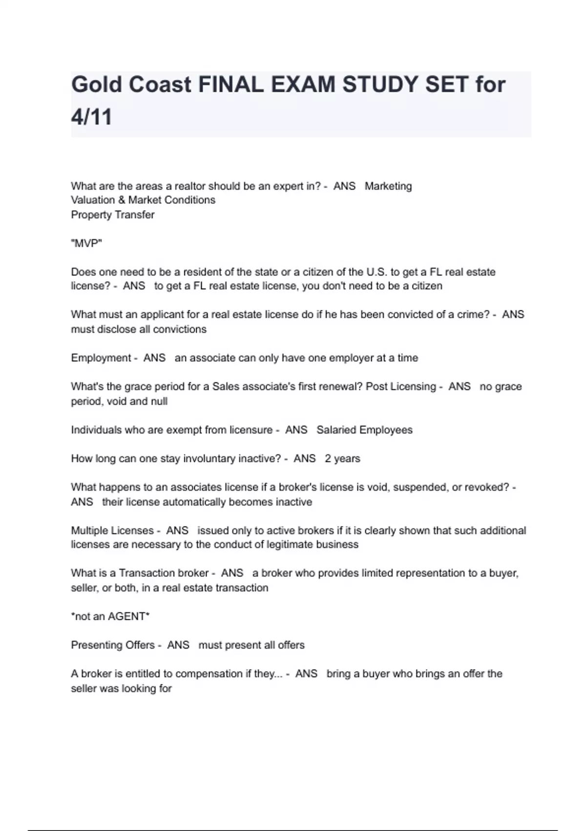 Gold Coast FINAL EXAM STUDY SET for 4/11 Exam Questions And Answers What are the areas a realtor should be an expert in? - ANS Marketing Valuation & Market Conditions Property Transfer "MVP" Does one need to be a resident of the state or a citizen of the U.S. to get a FL real estate license? - ANS to get a FL real estate license, you don't need to be a citizen What must an applicant for a real estate license do if he has been convicted of a crime? - ANS must disclose all convictions Employment - ANS an associate can only have one employer at a time What's the grace period for a Sales associate's first renewal? Post Licensing - ANS no grace period, void and null Individuals who are exempt from licensure - ANS Salaried Employees How long can one stay involuntary inactive? - ANS 2 years What happens to an associates license if a broker's license is void, suspended, or revoked? - ANS their license automatically becomes inactive Multiple Licenses - ANS issued only to active brokers if it is clearly shown that such additional licenses are necessary to the conduct of legitimate business What is a Transaction broker - ANS a broker who provides limited representation to a buyer, seller, or both, in a real estate transaction *not an AGENT* Presenting Offers - ANS must present all offers A broker is entitled to compensation if they... - ANS bring a buyer who brings an offer the seller was looking for