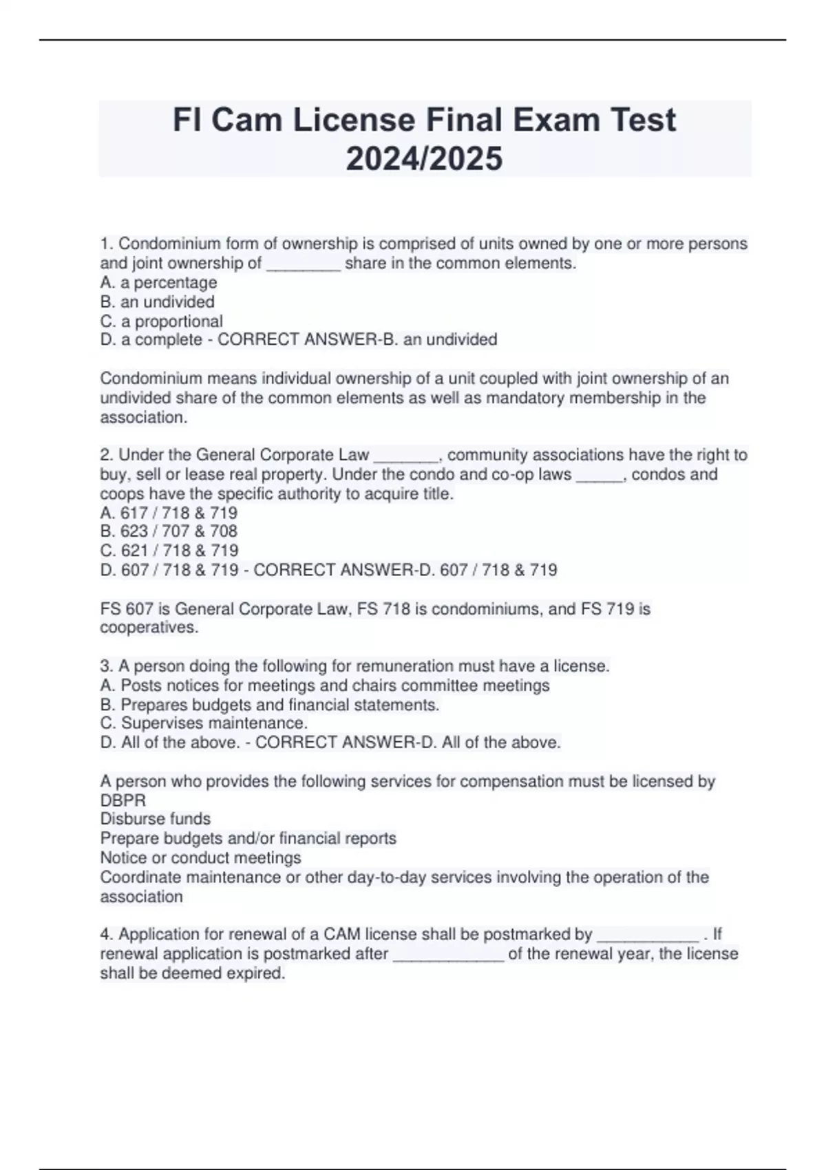 Fl Cam License Final Exam Test 2024/2025 1. Condominium form of ownership is comprised of units owned by one or more persons and joint ownership of ________ share in the common elements. A. a percentage B. an undivided C. a proportional D. a complete - CORRECT ANSWER-B. an undivided Condominium means individual ownership of a unit coupled with joint ownership of an undivided share of the common elements as well as mandatory membership in the association. 2. Under the General Corporate Law _______, community associations have the right to buy, sell or lease real property. Under the condo and co-op laws _____, condos and coops have the specific authority to acquire title. A. 617 / 718 & 719 B. 623 / 707 & 708 C. 621 / 718 & 719 D. 607 / 718 & 719 - CORRECT ANSWER-D. 607 / 718 & 719 FS 607 is General Corporate Law, FS 718 is condominiums, and FS 719 is cooperatives. 3. A person doing the following for remuneration must have a license. A. Posts notices for meetings and chairs committee meetings B. Prepares budgets and financial statements. C. Supervises maintenance. D. All of the above. - CORRECT ANSWER-D. All of the above. A person who provides the following services for compensation must be licensed by DBPR Disburse funds Prepare budgets and/or financial reports Notice or conduct meetings Coordinate maintenance or other day-to-day services involving the operation of the association 4. Application for renewal of a CAM license shall be postmarked by ___________ . If renewal application is postmarked after ____________ of the renewal year, the license shall be deemed expired. A. September 30, September 30 B. October 31, October 31 C. September 30, October 31 D. December 31, January 1 - CORRECT ANSWER-C. September 30, October 31 Renewal applications shall be postmarked on or before September 30 each even year. If the renewal application is postmarked after October 31, that license is deemed expired. 5. Restrictive covenants that run with the land as permanent restrictions remain in effect until ________. A. The majority of the owners vote otherwise B. All of the owners agree C. The developer cancels them D. The community is terminated - CORRECT ANSWER-D. The community is terminated When you purchase, you know that these covenants exist and will continue to exist for the life of the condominium or parcel and upon resale, the next owner inherits the same covenants. This is called running with the land. 6. The Cooperative documents must contain all of following except ________. A. Documentation of each owner B. Identification by unit number/letter C. Recognition of owner D. Definition of the grounds lease - CORRECT ANSWER-B. Identification by unit number/letter Under Cooperative law, the co-op documents include the Articles of Incorporation and By-Laws, a definition of the grounds lease, the owner's share and membership in the co-op and title or right to use of a unit. 7. The ______ creates the association and the ______ creates the condominium. A. Declaration of Condominium / Articles of Incorporation B. By-Laws / Declaration C. Articles of Incorporation / Declaration D. Articles of Incorporation / Bylaws - CORRECT ANSWER-C. Articles of Incorporation / Declaration The Articles of Incorporation, also known as the Corporate Charter, are the documents that create the association. The Condominium is established when the developer records the Declaration of Condominium with the county clerk in the county seat of the county in which the condominium is to be built. 8. What defines the membership and the voting rights of the Association? A. Corporate Charter B. Declaration of Condominium C. By-Laws D. Rules and Regulations - CORRECT ANSWER-A. Corporate Charter The Articles of Incorporation, also known as the Corporate Charter, provide the framework for the organization of the association and define its membership and the voting rights of the members. 9. The ______ establish(es) the procedures for carrying out the day to day responsibilities of the association. A. Articles of Incorporation B. Declaration of Condominium C. By-laws D. Rules and Regulations - CORRECT ANSWER-C. By-laws The By-Laws establish the procedures for carrying out the association's responsibilities and clarify the day-to-day duties necessary to carry out the responsibilities of the association. 10. If the governing documents of an association conflict, which of the following is the proper order of priority? A. By-laws, Declaration, Articles of Incorporation, Board Rules and Regulations B. Declaration, Articles of Incorporation, By-laws, Board Rules & regulations C. Articles of Incorporation, Declaration, By-laws, Board Rules and Regulations D. Declaration, Board-approved Rules, Articles of Incorporation, By-laws - CORRECT ANSWER-B. Declaration, Articles of Incorporation, By-laws, Board Rules & regulations All of the documents should be consistent with each other. Their order of priority is: Declaration of Condominium Articles of Incorporation By-Laws Rules and Regulations 11. When we are talking about amending the documents, which of the following is correct? A. If proviso made and percentage stated, then that percent B. If no proviso, then 100% C. If proviso made but no percentage stated, then 66 2/3% D. All of the above - CORRECT ANSWER-D. All of the above Each document must provide for procedures for amendment. If they do not, then they can only be made with the approval of all of the owners. Usually documents provide for the percentage of owners necessary to amend the document. If the documents provide for amendment but do not state the percentage necessary then two-thirds of the owners must agree to the amendment. Summary