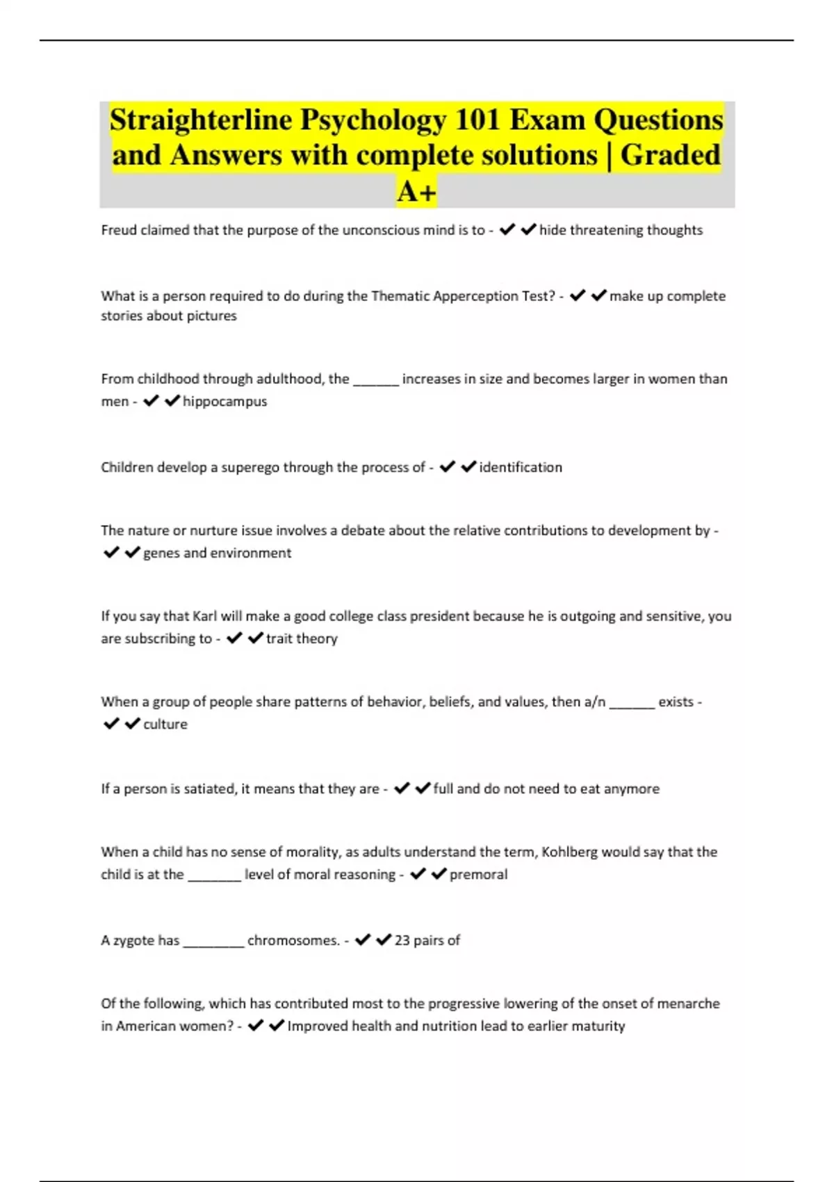 Straighterline Psychology 101 Exam Questions and Answers with complete solutions | Graded A+