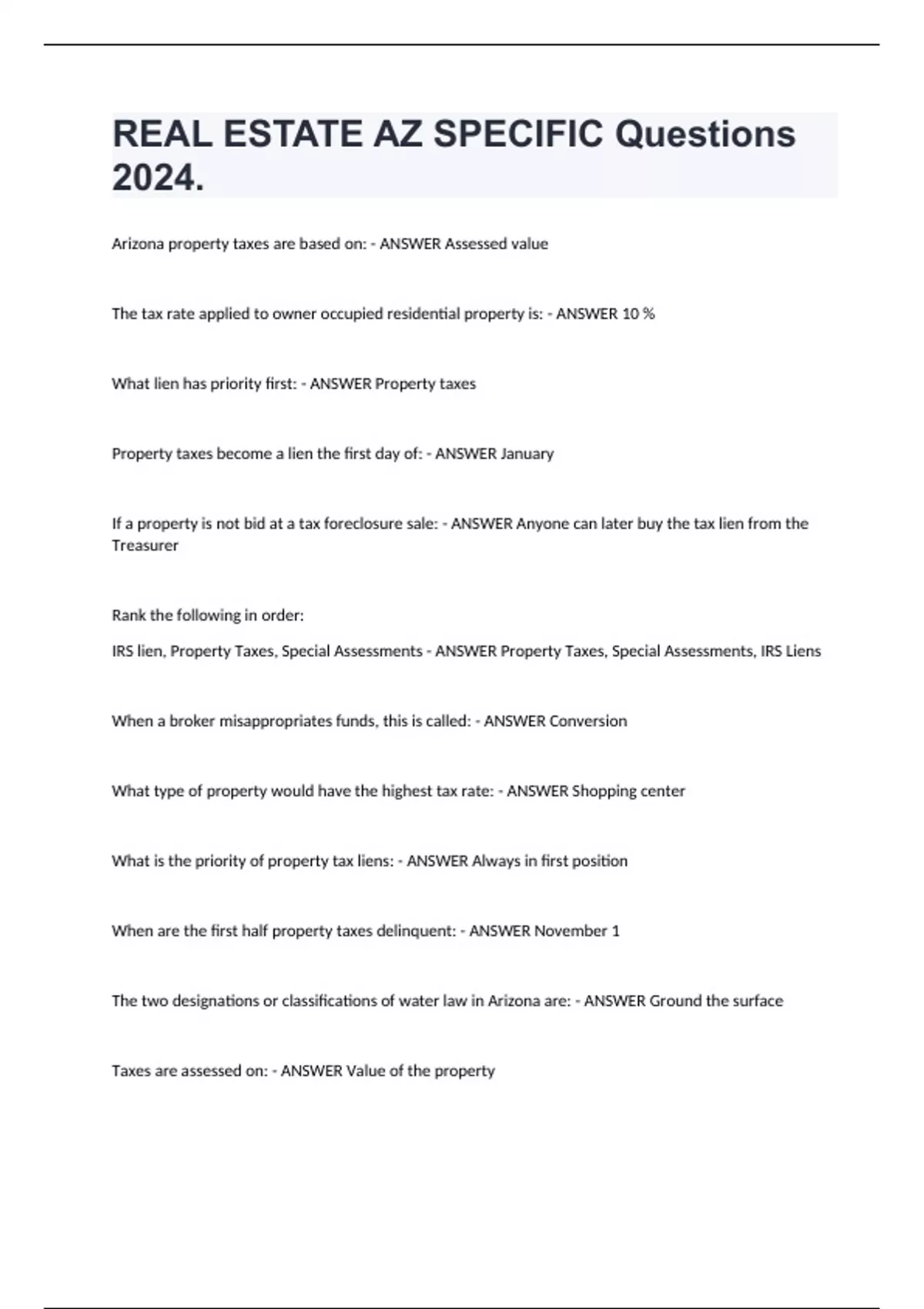 REAL ESTATE AZ SPECIFIC Questions 2024.Arizona property taxes are based on: - ANSWER Assessed value The tax rate applied to owner occupied residential property is: - ANSWER 10 % What lien has priority first: - ANSWER Property taxes Property taxes become a lien the first day of: - ANSWER January If a property is not bid at a tax foreclosure sale: - ANSWER Anyone can later buy the tax lien from the Treasurer Rank the following in order: IRS lien, Property Taxes, Special Assessments - ANSWER Property Taxes, Special Assessments, IRS Liens When a broker misappropriates funds, this is called: - ANSWER Conversion What type of property would have the highest tax rate: - ANSWER Shopping center What is the priority of property tax liens: - ANSWER Always in first position When are the first half property taxes delinquent: - ANSWER November 1 The two designations or classifications of water law in Arizona are: - ANSWER Ground the surface Taxes are assessed on: - ANSWER Value of the property