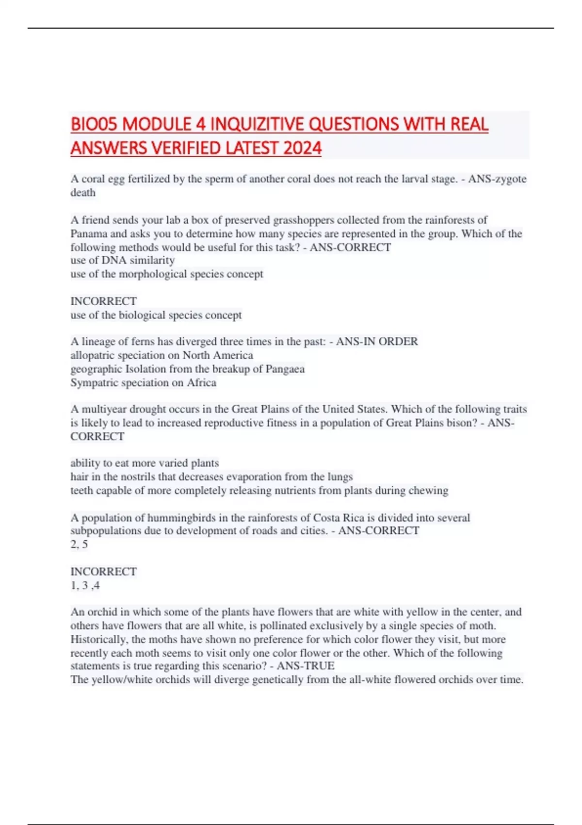 BIO05 MODULE 4 INQUIZITIVE QUESTIONS WITH REAL ANSWERS VERIFIED LATEST 2024 A coral egg fertilized by the sperm of another coral does not reach the larval stage. - ANS-zygote death A friend sends your lab a box of preserved grasshoppers collected from the rainforests of Panama and asks you to determine how many species are represented in the group. Which of the following methods would be useful for this task? - ANS-CORRECT use of DNA similarity use of the morphological species concept INCORRECT use of the biological species concept A lineage of ferns has diverged three times in the past: - ANS-IN ORDER allopatric speciation on North America geographic Isolation from the breakup of Pangaea Sympatric speciation on Africa A multiyear drought occurs in the Great Plains of the United States. Which of the following traits is likely to lead to increased reproductive fitness in a population of Great Plains bison? - ANSCORRECT ability to eat more varied plants hair in the nostrils that decreases evaporation from the lungs teeth capable of more completely releasing nutrients from plants during chewing A population of hummingbirds in the rainforests of Costa Rica is divided into several subpopulations due to development of roads and cities. - ANS-CORRECT 2, 5 INCORRECT 1, 3 ,4 An orchid in which some of the plants have flowers that are white with yellow in the center, and others have flowers that are all white, is pollinated exclusively by a single species of moth. Historically, the moths have shown no preference for which color flower they visit, but more recently each moth seems to visit only one color flower or the other. Which of the following statements is true regarding this scenario? - ANS-TRUE The yellow/white orchids will diverge genetically from the all-white flowered orchids over time. The orchid population may become two different species—white flowered and yellow/white flowered. Sympatric speciation may occur in th