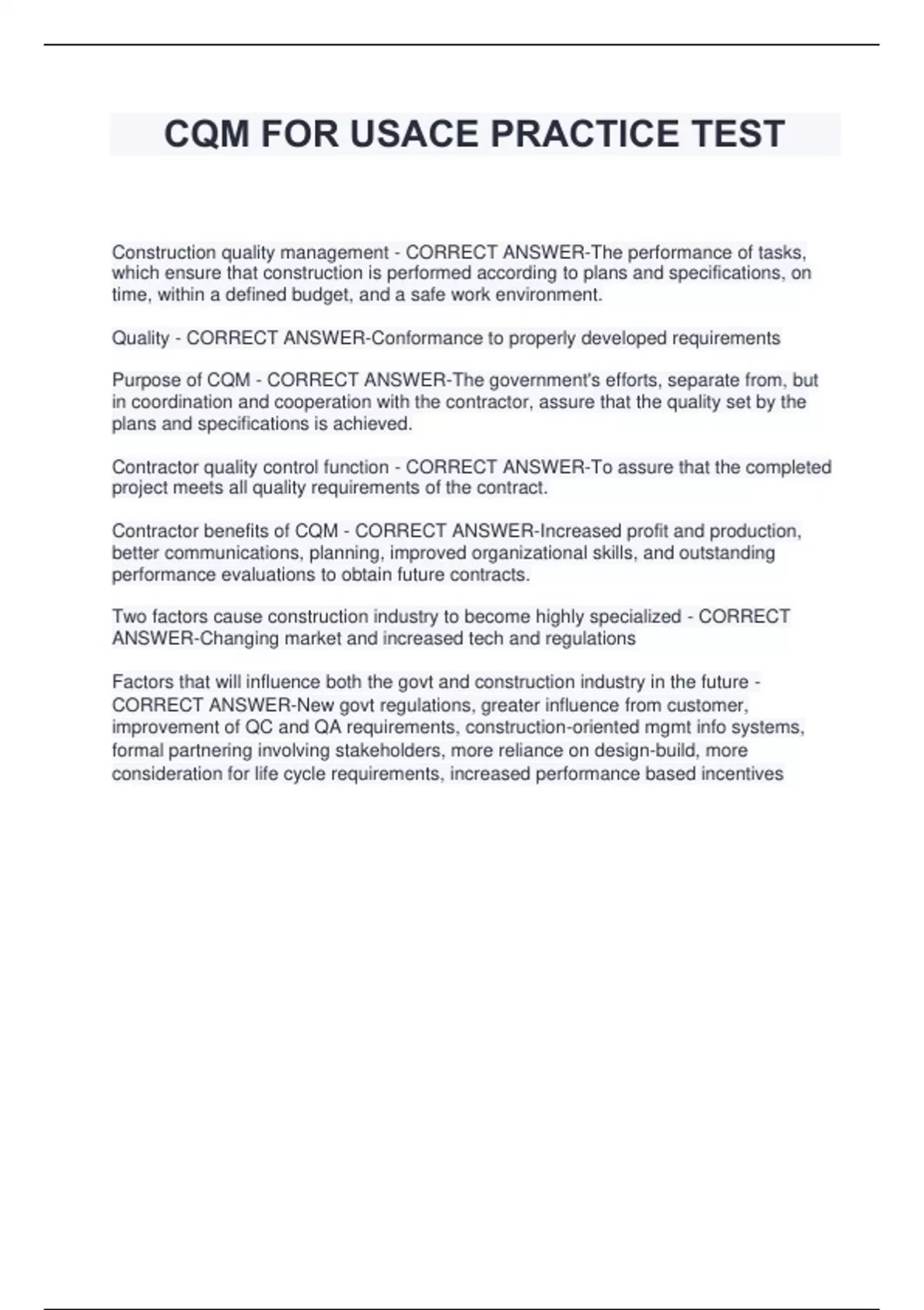 CQM FOR USACE PRACTICE TEST Construction quality management - CORRECT ANSWER-The performance of tasks, which ensure that construction is performed according to plans and specifications, on time, within a defined budget, and a safe work environment. Quality - CORRECT ANSWER-Conformance to properly developed requirements Purpose of CQM - CORRECT ANSWER-The government's efforts, separate from, but in coordination and cooperation with the contractor, assure that the quality set by the plans and specifications is achieved. Contractor quality control function - CORRECT ANSWER-To assure that the completed project meets all quality requirements of the contract