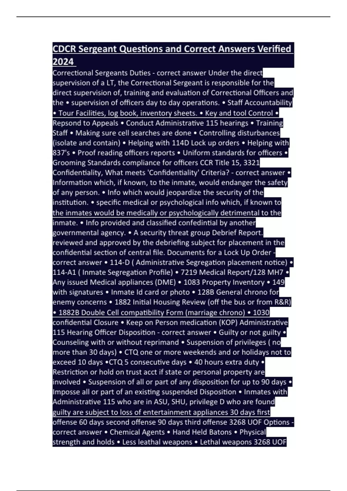 Correctional Sergeants Duties - correct answer Under the direct supervision of a LT, the Correctional Sergeant is responsible for the direct supervision of, training and evaluation of Correctional Officers and the • supervision of officers day to day operations. • Staff Accountability • Tour Facilities, log book, inventory sheets. • Key and tool Control • Repsond to Appeals • Conduct Administrative 115 hearings • Training Staff • Making sure cell searches are done • Controlling disturbances (isolate and contain) • Helping with 114D Lock up orders • Helping with 837's • Proof reading officers reports • Uniform standards for officers • Grooming Standards compliance for officers CCR Title 15, 3321 Confidentiality, What meets 'Confidentiality' Criteria? - correct answer • Information which, if known, to the inmate, would endanger the safety of any person. • Info which would jeopardize the security of the institution. • specific medical or psychological info which, if known to the inmates would be medically or psychologically detrimental to the inmate. • Info provided and classified confedintial by another governmental agency. • A security threat group Debrief Report. reviewed and approved by the debriefing subject for placement in the confidential section of central file. Documents for a Lock Up Order - correct answer • 114-D ( Administrative Segregation placement notice) • 114-A1 ( Inmate Segregation Profile) • 7219 Medical Report/128 MH7 • Any issued Medical appliances (DME) • 1083 Property Inventory • 149 with signatures • Inmate Id card or photo • 128B General chrono for enemy concerns • 1882 Initial Housing Review (off the bus or from R&R) • 1882B Double Cell compatibility Form (marriage chrono) • 1030 confidential Closure • Keep on Person medication (KOP) Administrative 115 Hearing Officer Disposition - correct answer • Guilty or not guilty • Counseling with or without reprimand • Suspension of privileges ( no more than 30 days) • CTQ one or more weekends and or holidays not to exceed 10 days •CTQ 5 consecutive days • 40 hours extra duty • Restriction or hold on trust acct if state or personal property are involved • Suspension of all or part of any disposition for up to 90 days • Imposse all or part of an existing suspended Disposition • Inmates with Administrative 115 who are in ASU, SHU, privilege D who are found guilty are subject to loss of entertainment appliances 30 days first offense 60 days second offense 90 days third offense 3268 UOF Options - correct answer • Chemical Agents • Hand Held Batons • Physical strength and holds • Less leathal weapons • Lethal weapons 3268 UOF