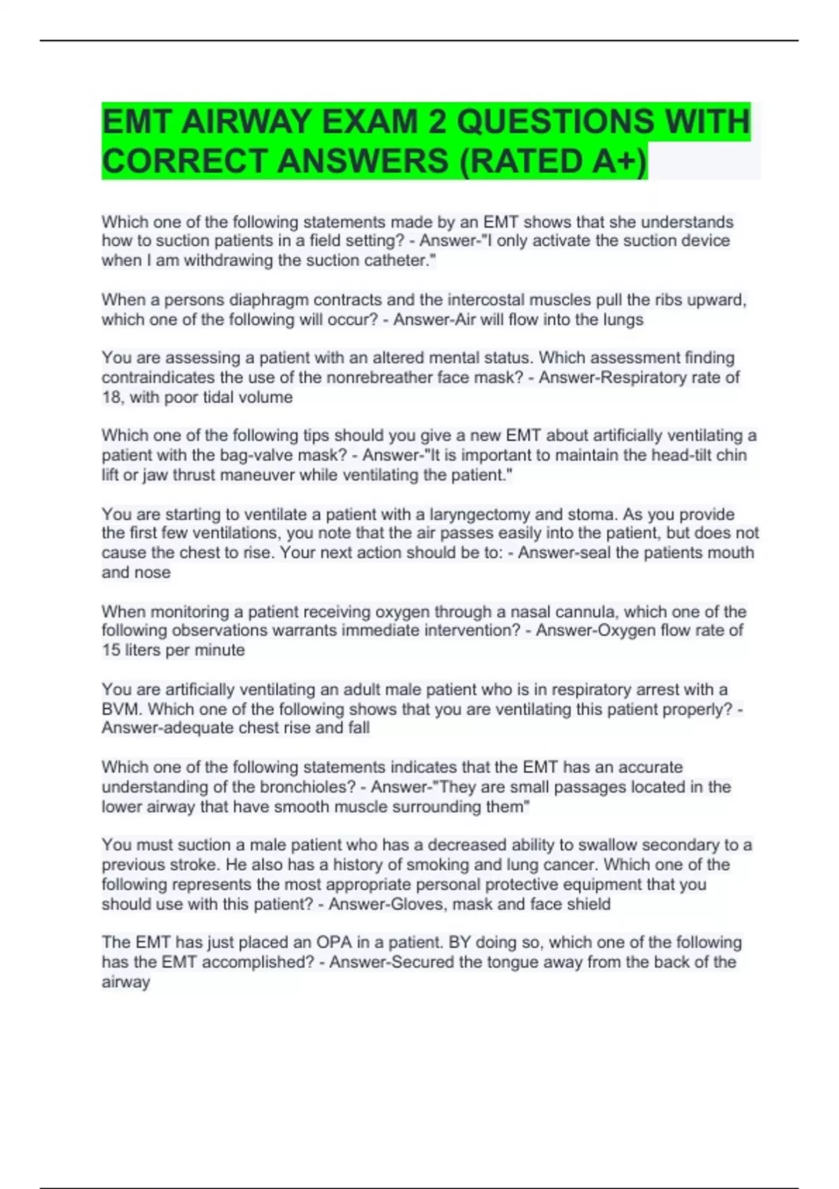The EMT has just placed an OPA in a patient. BY doing so, which one of the following has the EMT accomplished? - Answer-Secured the tongue away from the back of the airway The EMT should use the jaw thrust maneuver to open the airway for the patient with which one of the following? - Answer-unresponsive after falling from a porch