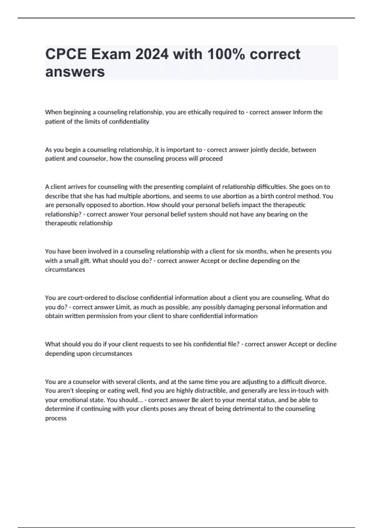 When beginning a counseling relationship, you are ethically required to - correct answer Inform the patient of the limits of confidentiality As you begin a counseling relationship, it is important to - correct answer jointly decide, between patient and counselor, how the counseling process will proceed A client arrives for counseling with the presenting complaint of relationship difficulties. She goes on to describe that she has had multiple abortions, and seems to use abortion as a birth control method. You are personally opposed to abortion. How should your personal beliefs impact the therapeutic relationship? - correct answer Your personal belief system should not have any bearing on the therapeutic relationship You have been involved in a counseling relationship with a client for six months, when he presents you with a small gift. What should you do? - correct answer Accept or decline depending on the circumstances You are court-ordered to disclose confidential information about a client you are counseling. What do you do? - correct answer Limit, as much as possible, any possibly damaging personal information and obtain written permission from your client to share confidential information What should you do if your client requests to see his confidential file? - correct answer Accept or decline depending upon circumstances You are a counselor with several clients, and at the same time you are adjusting to a difficult divorce. You aren't sleeping or eating well, find you are highly distractible, and generally are less in-touch with your emotional state. You should... - correct answer Be alert to your mental status, and be able to determine if continuing with your clients poses any threat of being detrimental to the counseling process