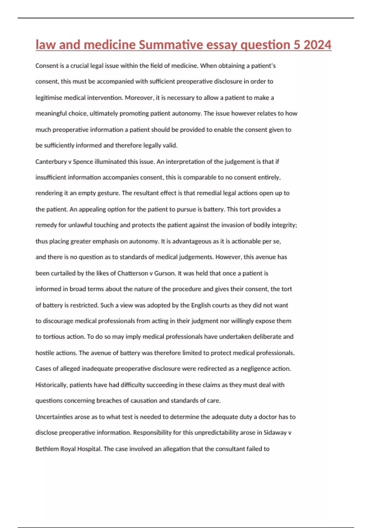 Consent is a crucial legal issue within the field of medicine. When obtaining a patient’s consent, this must be accompanied with sufficient preoperative disclosure in order to legitimise medical intervention. Moreover, it is necessary to allow a patient to make a meaningful choice, ultimately promoting patient autonomy. The issue however relates to how much preoperative information a patient should be provided to enable the consent given to be sufficiently informed and therefore legally valid. Canterbury v Spence illuminated this issue. An interpretation of the judgement is that if insufficient information accompanies consent, this is comparable to no consent entirely, rendering it an empty gesture. The resultant effect is that remedial legal actions open up to the patient. An appealing option for the patient to pursue is battery. This tort provides a remedy for unlawful touching and protects the patient against the invasion of bodily integrity; thus placing greater emphasis on autonomy. It is advantageous as it is actionable per se, and there is no question as to standards of medical judgements. However, this avenue has been curtailed by the likes of Chatterson v Gurson. It was held that once a patient is informed in broad terms about the nature of the procedure and gives their consent, the tort of battery is restricted. Such a view was adopted by the English courts as they did not want to discourage medical professionals from acting in their judgment nor willingly expose them to tortious action. To do so may imply medical professionals have undertaken deliberate and hostile actions. The avenue of battery was therefore limited to protect medical professionals. Cases of alleged inadequate preoperative disclosure were redirected as a negligence action. Historically, patients have had difficulty succeeding in these claims as they must deal with questions concerning breaches of causation and standards of care. Uncertainties arose as to what test is needed to determine the adequate duty a doctor has to disclose preoperative information. Responsibility for this unpredictability arose in Sidaway v Bethlem Royal Hospital. The case involved an allegation that the consultant failed to disclose the risk of spinal cord damage. Confusion was created as there was no consistent line of reasoning throughout the judgement. Lord Scarman adopted a prudent patient standard as illustrated in Canterbury v Spence. In contrast, Lord Diplock took a narrow perspective and failed to consider why a patient required information to make an informed choice. The key ratio was provided by Lord Bridge, who predominantly found merit in applying the Bolam standard, unless there was a substantial risk of grave and adverse consequences. This left a difficulty in considering what is meant by a ‘substantial risk’. The law was left uncertain as to whether it was based upon percentage rate occurrence, or on the severity of consequences. Sidaway gave little guidance on this and thus English law was left in this state for a considerable time. Incremental developments arose from cases, signifying an increase in the importance of patient autonomy and an unease with judges as to the suggestions left following Sidaway. A step forward stemmed from Pearce v United Bristol NHS Health Trust, a decision that inserted terminology of the reasonable patient where it had not previously. This was followed by Birch v UCLH NHS Trust that suggested an obligation to inform the patient of alternative procedures, and Chester v Afshar that altered the legal rules to give effect to autonomy, recognising it required greater attention. The societal understanding of the doctor-patient relationship also changed and developments emanated within the medical field. Prior to Sidaway was the ingrained paternalistic culture that the ‘doctor knows best’ and patients unquestioningly handed themselves over to the expert, which Professor Jones attributes to the imbalance of power between the parties. To reflect the change from this perspective, the GMC articulated elaborate standards of informed consent, and thus the medical field advanced beyond any standard that the law required. This did however, lead to a discrepancy. Montgomery v Lanarkshire Health Board took the opportunity to change the test provided from Sidaway and consequently provided a key judgement that considered material risk. Itasked whether a reasonable patient would consider the risk to be material, an objective lens; and whether the particular patient would consider the risk to be material also. If this was the case, information had to be disclosed. The introduction of a subjective element, looking at the perspective of the individual patient and their circumstance, refocused the emphasis of the doctor-patient relationship. Patients
