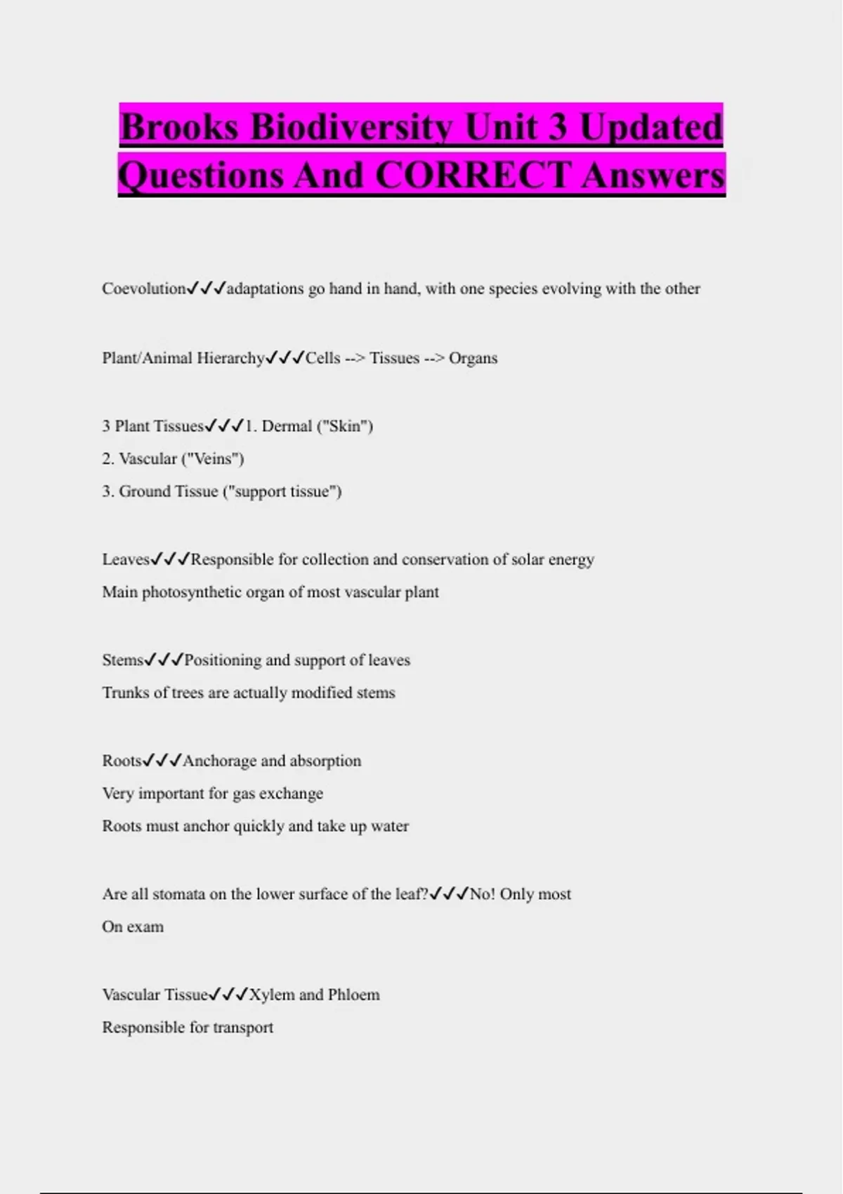 Coevolutionadaptations go hand in hand, with one species evolving with the other Plant/Animal HierarchyCells --> Tissues --> Organs 3 Plant Tissues1. Dermal ("Skin") 2. Vascular ("Veins") 3. Ground Tissue ("support tissue") LeavesResponsible for collection and conservation of solar energy Main photosynthetic organ of most vascular plant StemsPositioning and support of leaves Trunks of trees are actually modified stems