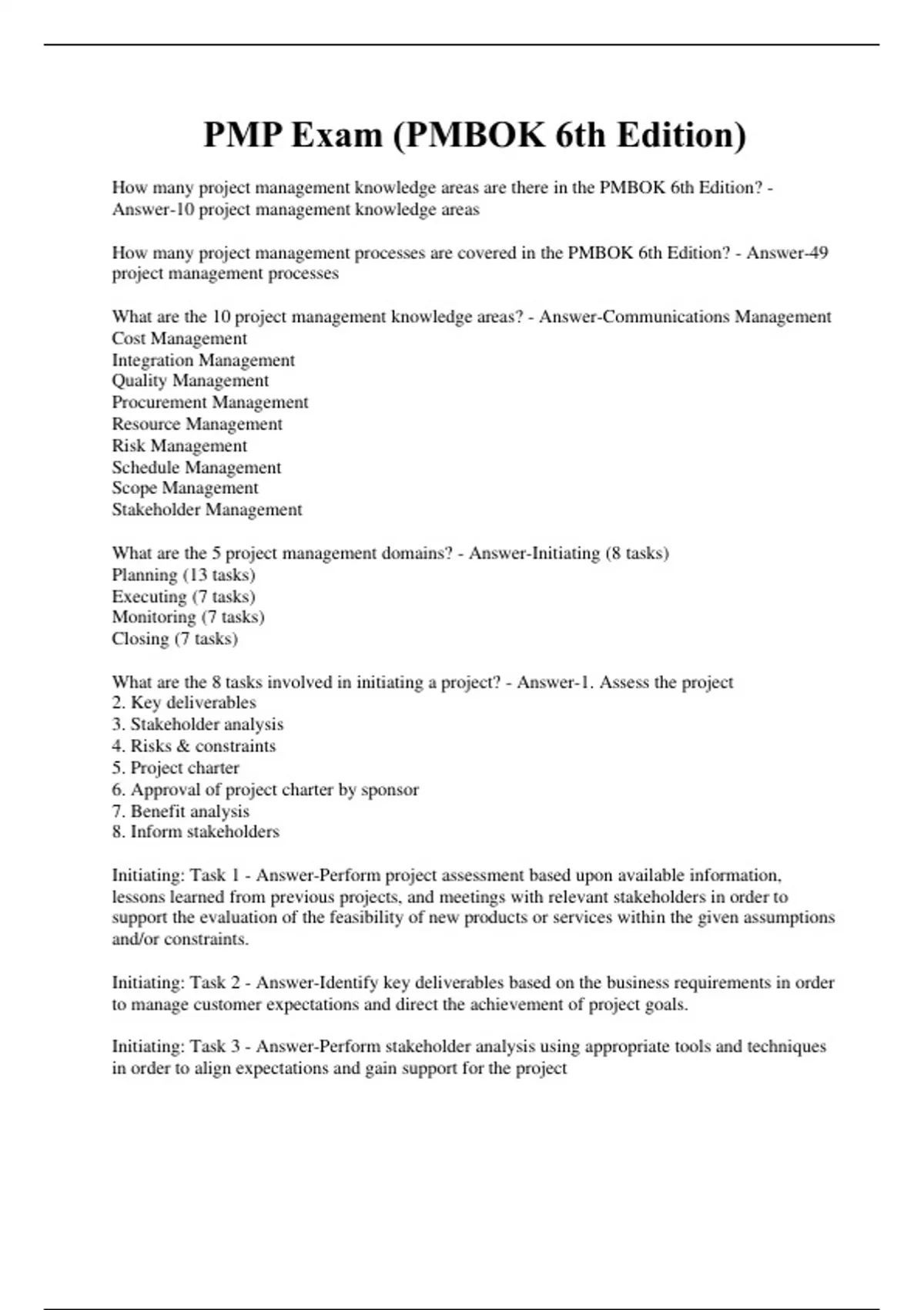 How many project management knowledge areas are there in the PMBOK 6th Edition? - Answer-10 project management knowledge areas How many project management processes are covered in the PMBOK 6th Edition? - Answer-49 project management processes What are the 10 project management knowledge areas? - Answer-Communications Management Cost Management Integration Management Quality Management Procurement Management Resource Management Risk Management Schedule Management Scope Management Stakeholder Management What are the 5 project management domains? - Answer-Initiating (8 tasks) Planning (13 tasks) Executing (7 tasks) Monitoring (7 tasks) Closing (7 tasks) What are the 8 tasks involved in initiating a project? - Answer-1. Assess the project 2. Key deliverables 3. Stakeholder analysis 4. Risks & constraints 5. Project charter 6. Approval of project charter by sponsor 7. Benefit analysis 8. Inform stakeholders Initiating: Task 1 - Answer-Perform project assessment based upon available information, lessons learned from previous projects, and meetings with relevant stakeholders in order to support the evaluation of the feasibility of new products or services within the given assumptions and/or constraints. Initiating: Task 2 - Answer-Identify key deliverables based on the business requirements in order to manage customer expectations and direct the achievement of project goals. Initiating: Task 3 - Answer-Perform stakeholder analysis using appropriate tools and techniques in order to align expectations and gain support for the project