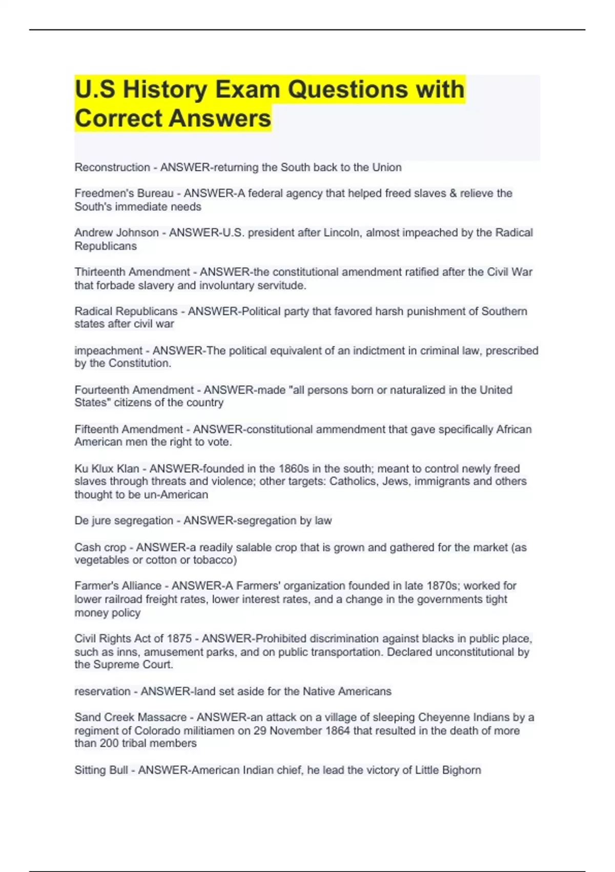 Reconstruction - ANSWER-returning the South back to the Union Freedmen's Bureau - ANSWER-A federal agency that helped freed slaves & relieve the South's immediate needs Andrew Johnson - ANSWER-U.S. president after Lincoln, almost impeached by the Radical Republicans Thirteenth Amendment - ANSWER-the constitutional amendment ratified after the Civil War that forbade slavery and involuntary servitude. Radical Republicans - ANSWER-Political party that favored harsh punishment of Southern states after civil war impeachment - ANSWER-The political equivalent of an indictment in criminal law, prescribed by the Constitution. Fourteenth Amendment - ANSWER-made "all persons born or naturalized in the United States" citizens of the country Fifteenth Amendment - ANSWER-constitutional ammendment that gave specifically African American men the right to vote. Ku Klux Klan - ANSWER-founded in the 1860s in the south; meant to control newly freed slaves through threats and violence; other targets: Catholics, Jews, immigrants and others thought to be un-American De jure segregation - ANSWER-segregation by law Cash crop - ANSWER-a readily salable crop that is grown and gathered for the market (as vegetables or cotton or tobacco) Farmer's Alliance - ANSWER-A Farmers' organization founded in late 1870s; worked for lower railroad freight rates, lower interest rates, and a change in the governments tight money policy Civil Rights Act of 1875 - ANSWER-Prohibited discrimination against blacks in public place, such as inns, amusement parks, and on public transportation. Declared unconstitutional by the Supreme Court. reservation - ANSWER-land set aside for the Native Americans Sand Creek Massacre - ANSWER-an attack on a village of sleeping Cheyenne Indians by a regiment of Colorado militiamen on 29 November 1864 that resulted in the death of more than 200 tribal members Sitting Bull - ANSWER-American Indian chief, he lead the victory of Little Bighorn