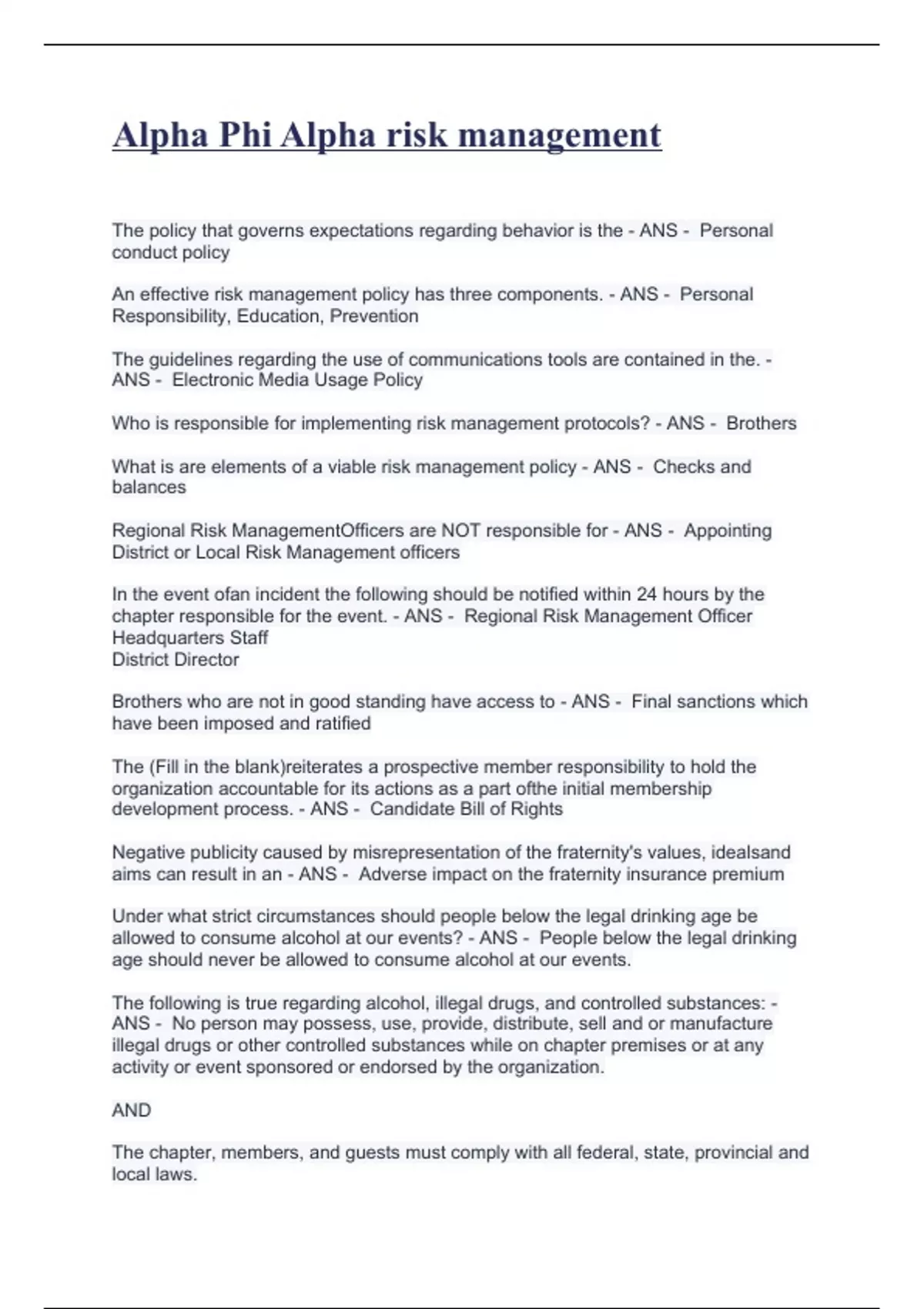 The policy that governs expectations regarding behavior is the - ANS - Personal conduct policy An effective risk management policy has three components. - ANS - Personal Responsibility, Education, Prevention The guidelines regarding the use of communications tools are contained in the. - ANS - Electronic Media Usage Policy Who is responsible for implementing risk management protocols? - ANS - Brothers What is are elements of a viable risk management policy - ANS - Checks and balances Regional Risk ManagementOfficers are NOT responsible for - ANS - Appointing District or Local Risk Management officers In the event ofan incident the following should be notified within 24 hours by the chapter responsible for the event. - ANS - Regional Risk Management Officer Headquarters Staff District Director Brothers who are not in good standing have access to - ANS - Final sanctions which have been imposed and ratified The (Fill in the blank)reiterates a prospective member responsibility to hold the organization accountable for its actions as a part ofthe initial membership development process. - ANS - Candidate Bill of Rights Negative publicity caused by misrepresentation of the fraternity's values, idealsand aims can result in an - ANS - Adverse impact on the fraternity insurance premium Under what strict circumstances should people below the legal drinking age be allowed to consume alcohol at our events? - ANS - People below the legal drinking age should never be allowed to consume alcohol at our events. The following is true regarding alcohol, illegal drugs, and controlled substances: - ANS - No person may possess, use, provide, distribute, sell and or manufacture illegal drugs or other controlled substances while on chapter premises or at any activity or event sponsored or endorsed by the organization. AND The chapter, members, and guests must comply with all federal