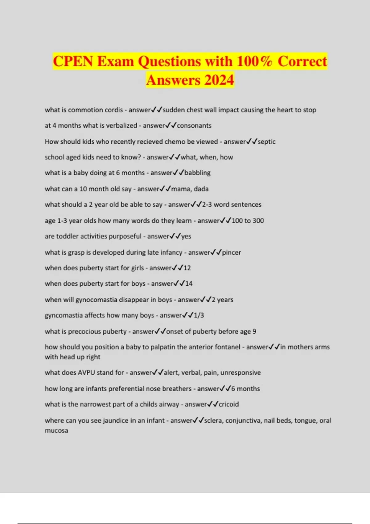 CPEN Exam Questions with 100% Correct Answers 2024 what is commotion cordis - answersudden chest wall impact causing the heart to stop at 4 months what is verbalized - answerconsonants How should kids who recently recieved chemo be viewed - answerseptic school aged kids need to know? - answerwhat, when, how what is a baby doing at 6 months - answerbabbling what can a 10 month old say - answermama, dada what should a 2 year old be able to say - answer2-3 word sentences age 1-3 year olds how many words do they learn - answer100 to 300 are toddler activities purposeful - answeryes what is grasp is developed during late infancy - answerpincer when does puberty start for girls - answer12 when does puberty start for boys - answer14 when will gynocomastia disappear in boys - answer2 years gyncomastia affects how many boys - answer1/3 what is precocious puberty - answeronset of puberty before age 9 how should you position a baby to palpatin the anterior fontanel - answerin mothers arms with head up right what does AVPU stand for - answeralert, verbal, pain, unresponsive how long are infants preferential nose breathers - answer6 months what is the narrowest part of a childs airway - answercricoid where can you see jaundice in an infant - answersclera, conjunctiva, nail beds, tongue, oral mucosa what is the bp formulay - answer70+(2x age in years) when do toddlers respond to no by - answer10-12months what is PAT used for - answersick or not what are the 3 things that PAT is used to assess for - answerappearance, breathing, circulation what can placing a young patient supine on a traditional spine or papoose board result in - answercervical spinal flexion describe a toddlers personality - answershort attention span, respond well to rewards what type of thinkers are preschool children - answerconcrete what type of instructions do you give a preschool child - answershort, simple, clear what is normal infant respiratory rate - answer30-50 is hypotension a late sign - answeryes at 2 months of age what should the child be able to do - answerhold head up at 4 months what can a child do - answerroll over at 6 months what should a child be able to do - answersit unsupported at 12 months what should a child be able to do - answerwalk what are posterior rib fractures most consistent with - answerchild abuse what is DOPE used for - answerrespiratory distress on ventilators what does DOPE stand for - answerDisplacement Obstruction Pneumothorax Equipment what is the formula to determine where you should tape an ETT - answer3 x ETT where should you first listen after placing an ETT - answerthe stomach why do you immediately flush an IO after placing it - answerdisplace thick fibrin network what is the formula to determine ETT size - answer(age in years/4)+4
