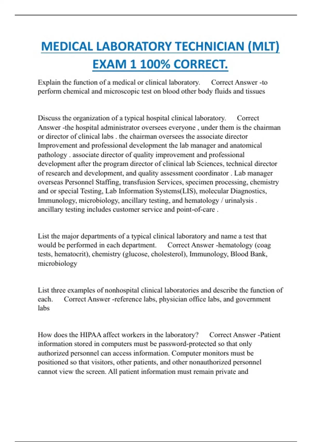 MEDICAL LABORATORY TECHNICIAN (MLT) EXAM 1 100% CORRECT.