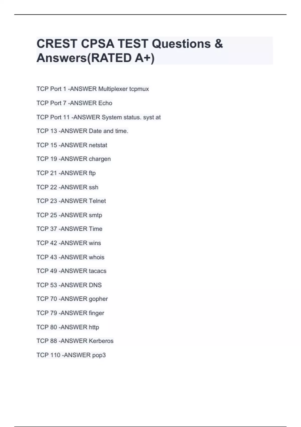 TCP Port 1 -ANSWER Multiplexer tcpmux TCP Port 7 -ANSWER Echo TCP Port 11 -ANSWER System status. syst at TCP 13 -ANSWER Date and time. TCP 15 -ANSWER netstat TCP 19 -ANSWER chargen TCP 21 -ANSWER ftp TCP 22 -ANSWER ssh TCP 23 -ANSWER Telnet TCP 25 -ANSWER smtp TCP 37 -ANSWER Time TCP 42 -ANSWER wins TCP 43 -ANSWER whois TCP 49 -ANSWER tacacs TCP 53 -ANSWER DNS TCP 70 -ANSWER gopher TCP 79 -ANSWER finger TCP 80 -ANSWER http TCP 88 -ANSWER Kerberos TCP 110 -ANSWER pop3
