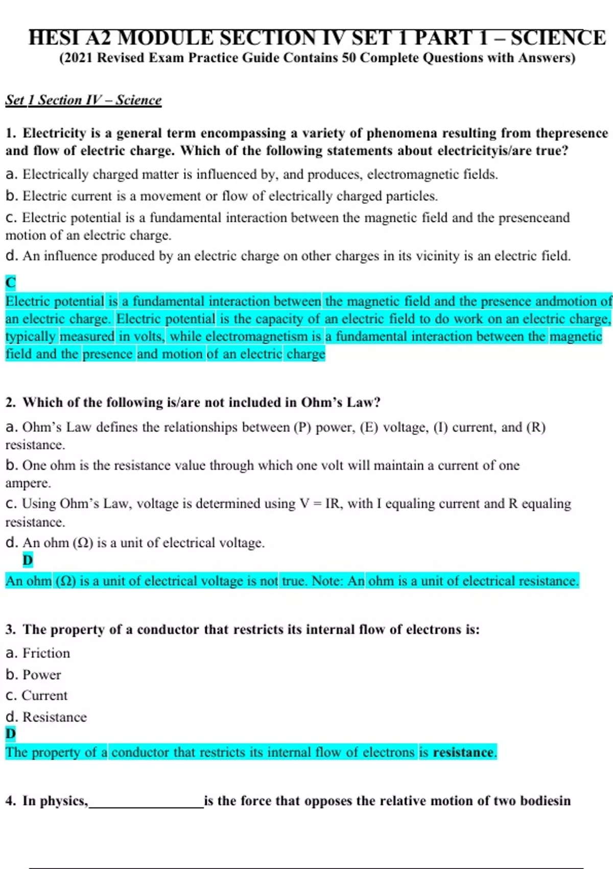 HESI A2 MODULE SECTION IV SET 1 PART 1 – SCIENCE (2021 Revised Exam Practice Guide Contains 50 Complete Questions with Answers) Set 1 Section IV – Science 1. Electricity is a general term encompassing a variety of phenomena resulting from thepresence and flow of electric charge. Which of the following statements about electricityis/are true? a. Electrically charged matter is influenced by, and produces, electromagnetic fields. b. Electric current is a movement or flow of electrically charged particles. c. Electric potential is a fundamental interaction between the magnetic field and the presenceand motion of an electric charge. d. An influence produced by an electric charge on other charges in its vicinity is an electric field. C Electric potential is a fundamental interaction between the magnetic field and the presence andmotion of an electric charge. Electric potential is the capacity of an electric field to do work on an electric charge, typically measured in volts, while electromagnetism is a fundamental interaction between the magnetic field and the presence and motion of an electric charge 2. Which of the following is/are not included in Ohm’s Law? a. Ohm’s Law defines the relationships between (P) power, (E) voltage, (I) current, and (R) resistance. b. One ohm is the resistance value through which one volt will maintain a current of one ampere. c. Using Ohm’s Law, voltage is determined using V = IR, with I equaling current and R equaling resistance. d. An ohm (Ω) is a unit of electrical voltage. D An ohm (Ω) is a unit of electrical voltage is not true. Note: An ohm is a unit of electrical resistance. 3. The property of a conductor that restricts its internal flow of electrons is: a. Friction b. Power c. Current d. Resistance D The property of a conductor that restricts its internal flow of electrons is resistance. 4. In physics, is the force that opposes the relative motion of two bodiesin
