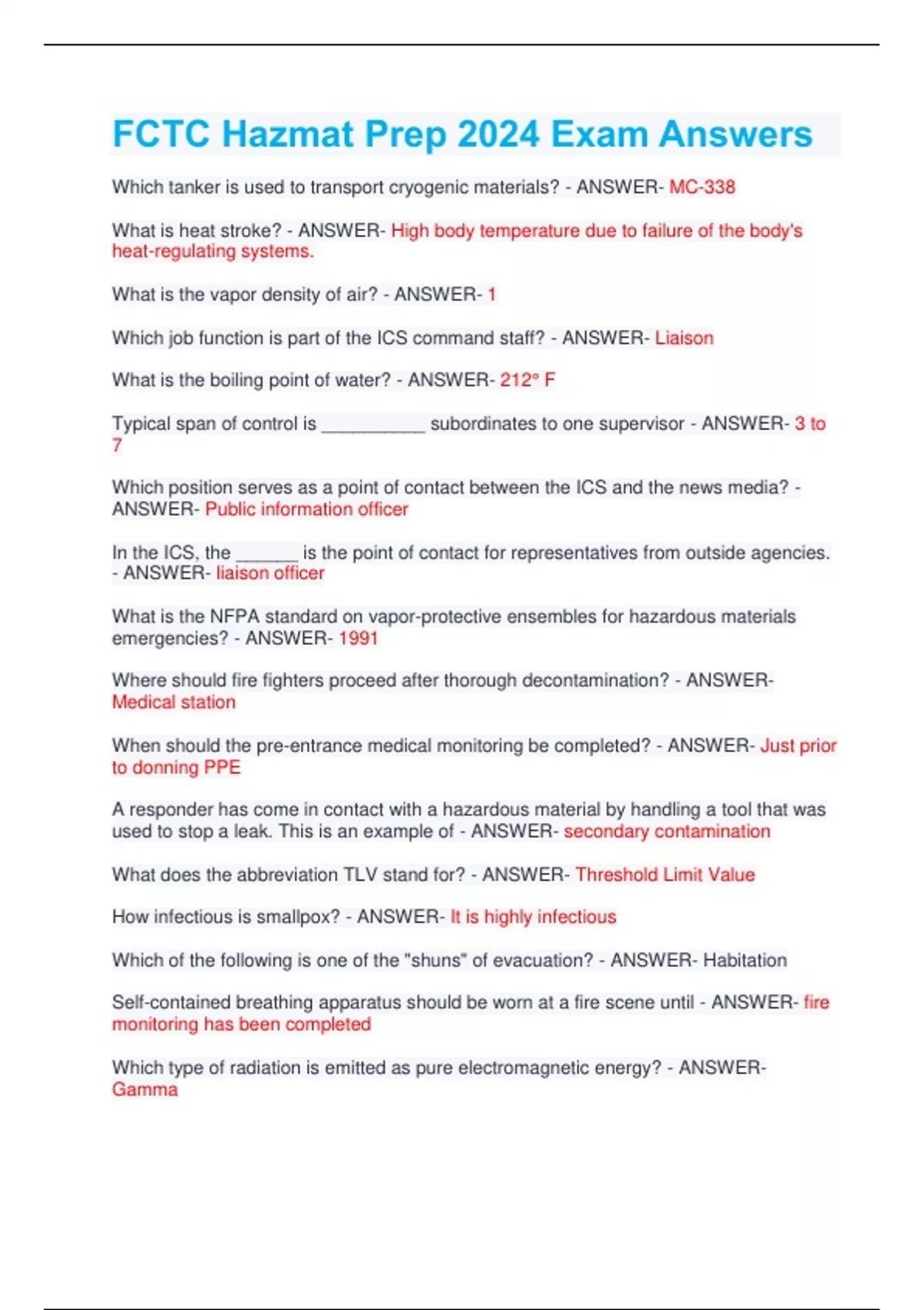 FCTC Hazmat Prep 2024 Exam Answers Which tanker is used to transport cryogenic materials? - ANSWER- MC-338 What is heat stroke? - ANSWER- High body temperature due to failure of the body's heat-regulating systems. What is the vapor density of air? - ANSWER- 1 Which job function is part of the ICS command staff? - ANSWER- Liaison What is the boiling point of water? - ANSWER- 212° F Typical span of control is __________ subordinates to one supervisor - ANSWER- 3 to 7 Which position serves as a point of contact between the ICS and the news media? - ANSWER- Public information officer In the ICS, the ______ is the point of contact for representatives from outside agencies. - ANSWER- liaison officer What is the NFPA standard on vapor-protective ensembles for hazardous materials emergencies? - ANSWER- 1991 Where should fire fighters proceed after thorough decontamination? - ANSWERMedical station When should the pre-entrance medical monitoring be completed? - ANSWER- Just prior to donning PPE
