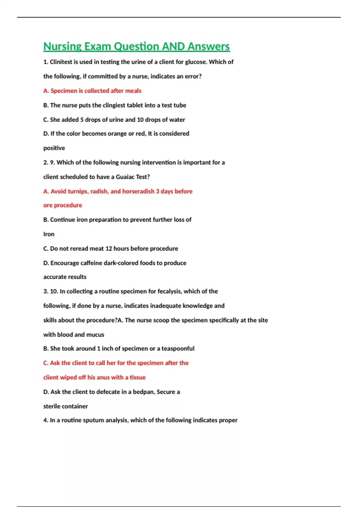 1. Clinitest is used in testing the urine of a client for glucose. Which of the following, if committed by a nurse, indicates an error? A. Specimen is collected after meals B. The nurse puts the clingiest tablet into a test tube C. She added 5 drops of urine and 10 drops of water D. If the color becomes orange or red, It is considered positive 2. 9. Which of the following nursing intervention is important for a client scheduled to have a Guaiac Test? A. Avoid turnips, radish, and horseradish 3 days before ore procedure B. Continue iron preparation to prevent further loss of Iron C. Do not reread meat 12 hours before procedure D. Encourage caffeine dark-colored foods to produce accurate results 3. 10. In collecting a routine specimen for fecalysis, which of the following, if done by a nurse, indicates inadequate knowledge and skills about the procedure?A. The nurse scoop the specimen specifically at the site with blood and mucus B. She took around 1 inch of specimen or a teaspoonful C. Ask the client to call her for the specimen after the client wiped off his anus with a tissue D. Ask the client to defecate in a bedpan, Secure a sterile container 4. In a routine sputum analysis, which of the following indicates proper nursing action before sputum collection? A. Secure a clean container B. Discard the container if the outside becomes contaminated with the sputum C. Rinse the client’s mouth with Listerine after collection D. Tell the client that 4 tablespoon of sputum is needed for each specimen for a routine sputum analysis 5. 12. Who collects blood specimen? A. The nurse B. Medical technologist C. Physician3 | P a g e D. Physical therapist 6. 13. David, 68 year old male client is scheduled for Serum Lipid analysis. Which of the following health teaching is important to ensure accurate reading? A. Tell the patient to eat fatty meals 3 days prior to the procedure