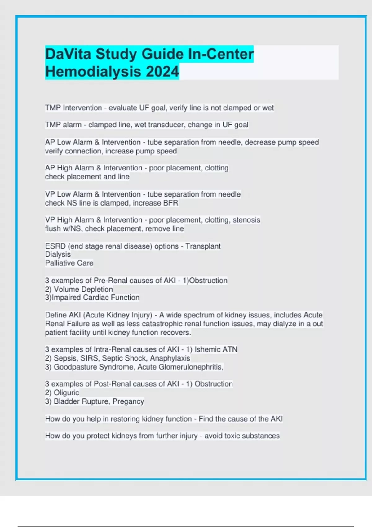 TMP Intervention - evaluate UF goal, verify line is not clamped or wet TMP alarm - clamped line, wet transducer, change in UF goal AP Low Alarm & Intervention - tube separation from needle, decrease pump speed verify connection, increase pump speed AP High Alarm & Intervention - poor placement, clotting check placement and line VP Low Alarm & Intervention - tube separation from needle check NS line is clamped, increase BFR VP High Alarm & Intervention - poor placement, clotting, stenosis flush w/NS, check placement, remove line ESRD (end stage renal disease) options - Transplant Dialysis Palliative Care 3 examples of Pre-Renal causes of AKI - 1)Obstruction 2) Volume Depletion 3)Impaired Cardiac Function Define AKI (Acute Kidney Injury) - A wide spectrum of kidney issues, includes Acute Renal Failure as well as less catastrophic renal function issues, may dialyze in a out patient facility until kidney function recovers. 3 examples of Intra-Renal causes of AKI - 1) Ishemic ATN 2) Sepsis, SIRS, Septic Shock, Anaphylaxis 3) Goodpasture Syndrome, Acute Glomerulonephritis, 3 examples of Post-Renal causes of AKI - 1) Obstruction 2) Oliguric 3) Bladder Rupture, Pregancy How do you help in restoring kidney function - Find the cause of the AKI How do you protect kidneys from further injury - avoid toxic substances What is important when monitoring Weight and BP - Keep them with a little extra fluid AKI patients are at increased risk for which complications - Hypovolemia and Hypotension What are the most common causes for CKD - HTN, DM, PKD What is CKD-MBD - Abnormalities in CA, PO4, PTH, and Vitamin D metabolism with soft tissue calcification and bone disease What are Phosphate Binders - Taken with all meals and snacks Excess sodium intake causes - Increased thirst and hypertension high potassium - Cause extreme muscle weakness and abnormal heart rhythm, this electrolyte can slow the heart's conduction system until no electrical impulses are conducted What is Albumin - Essential for growth, maintenance, preventing infection and anemia what is the distance between needles - 1.5 inches why use needle site rotation - prevents the formation of aneurysms and pseudoaneurysms 3 steps in access assessment - Look, Listen, Feel Over-manipulating needles can cause - bleeding from the needle site during dialysis NFACT Intermediate Cannulator - has at least 6 months of AV access cannulation experience and at least 10 successful cannulations on and established fistulae what is an intervention for muscle cramps - stretching the affected muscle what position is used for an Air Embolism - Left side Trendelenburg What is hypotension during treatment - its associated with increased mortality rate Dialysis Disequilibrium Syndrome (DDS) - patients who are skipping treatments Symptoms of disinfectant infusion - pain at the venous needle site, tingling around the lips and difficulty breathing. Best way to successfully help patients change behaviors - through support, compassion, and empathy