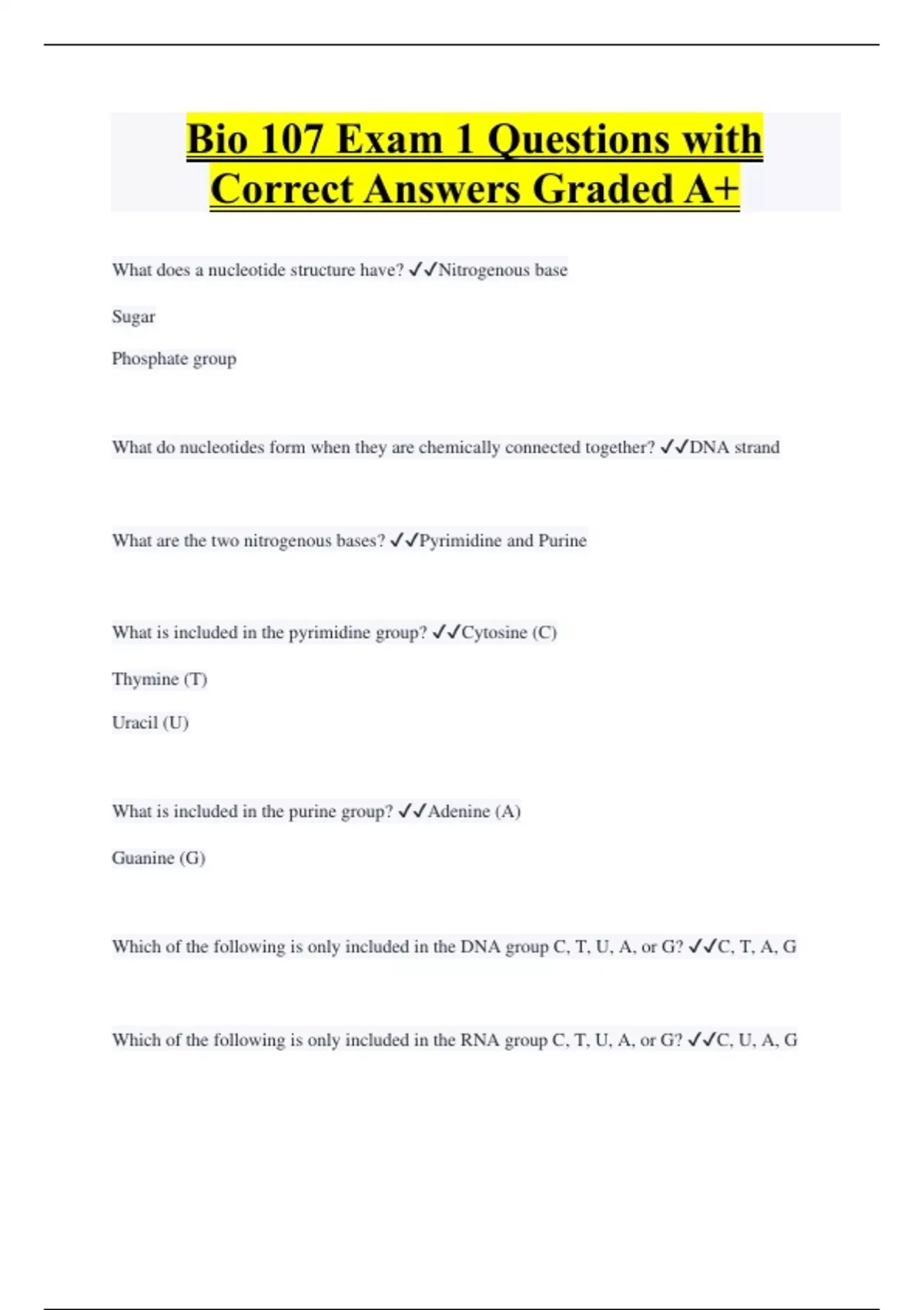 Bio 107 Exam 1 Questions with Correct Answers Graded A+ What does a nucleotide structure have? Nitrogenous base Sugar Phosphate group What do nucleotides form when they are chemically connected together? DNA strand What are the two nitrogenous bases? Pyrimidine and Purine What is included in the pyrimidine group? Cytosine (C) Thymine (T) Uracil (U) What is included in the purine group? Adenine (A) Guanine (G) Which of the following is only included in the DNA group C, T, U, A, or G? C, T, A, G Which of the following is only included in the RNA group C, T, U, A, or G? C, U, A, G