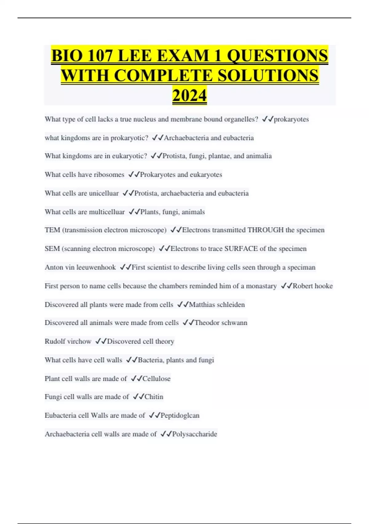 BIO 107 LEE EXAM 1 QUESTIONS WITH COMPLETE SOLUTIONS 2024 What type of cell lacks a true nucleus and membrane bound organelles? prokaryotes what kingdoms are in prokaryotic? Archaebacteria and eubacteria What kingdoms are in eukaryotic? Protista, fungi, plantae, and animalia What cells have ribosomes Prokaryotes and eukaryotes What cells are unicelluar Protista, archaebacteria and eubacteria What cells are multicelluar Plants, fungi, animals TEM (transmission electron microscope) Electrons transmitted THROUGH the specimen SEM (scanning electron microscope) Electrons to trace SURFACE of the specimen Anton vin leeuwenhook First scientist to describe living cells seen through a speciman First person to name cells because the chambers reminded him of a monastary Robert hooke Discovered all plants were made from cells Matthias schleiden Discovered all animals were made from cells Theodor schwann Rudolf virchow Discovered cell theory What cells have cell walls Bacteria, plants and fungi Plant cell walls are made of Cellulose Fungi cell walls are made of Chitin Eubacteria cell Walls are made of Peptidoglcan Archaebacteria cell walls are made of Polysaccharide