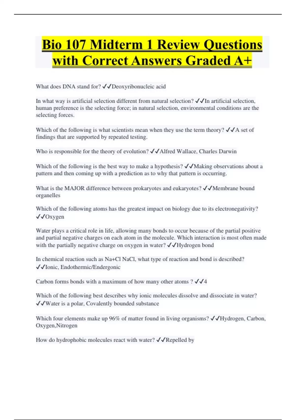 Bio 107 Midterm 1 Review Questions with Correct Answers Graded A+ What does DNA stand for? Deoxyribonucleic acid In what way is artificial selection different from natural selection? In artificial selection, human preference is the selecting force; in natural selection, environmental conditions are the selecting forces. Which of the following is what scientists mean when they use the term theory? A set of findings that are supported by repeated testing. Who is responsible for the theory of evolution? Alfred Wallace, Charles Darwin Which of the following is the best way to make a hypothesis? Making observations about a pattern and then coming up with a prediction as to why that pattern is occurring. What is the MAJOR difference between prokaryotes and eukaryotes? Membrane bound organelles Which of the following atoms has the greatest impact on biology due to its electronegativity? Oxygen Water plays a critical role in life, allowing many bonds to occur because of the partial positive and partial negative charges on each atom in the molecule. Which interaction is most often made with the partially negative charge on oxygen in water? Hydrogen bond In chemical reaction such as Na+Cl NaCl, what type of reaction and bond is described? Ionic, Endothermic/Endergonic Carbon forms bonds with a maximum of how many other atoms ? 4 Which of the following best describes why ionic molecules dissolve and dissociate in water? Water is a polar, Covalently bounded substance Which four elements make up 96% of matter found in living organisms? Hydrogen, Carbon, Oxygen,Nitrogen How do hydrophobic molecules react with water? Repelled by