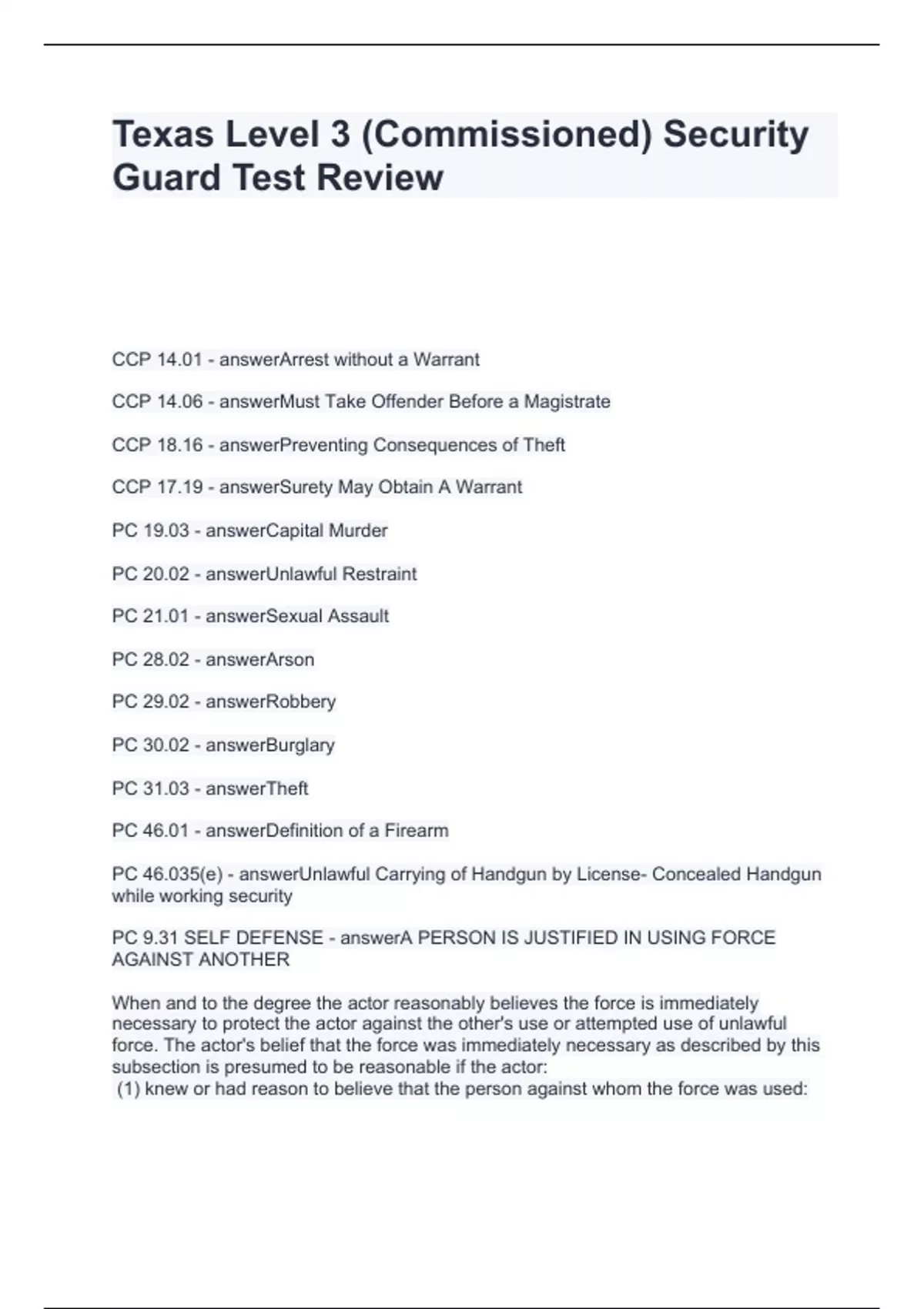 Texas Level 3 (Commissioned) Security Guard Test Review Questions with solutions