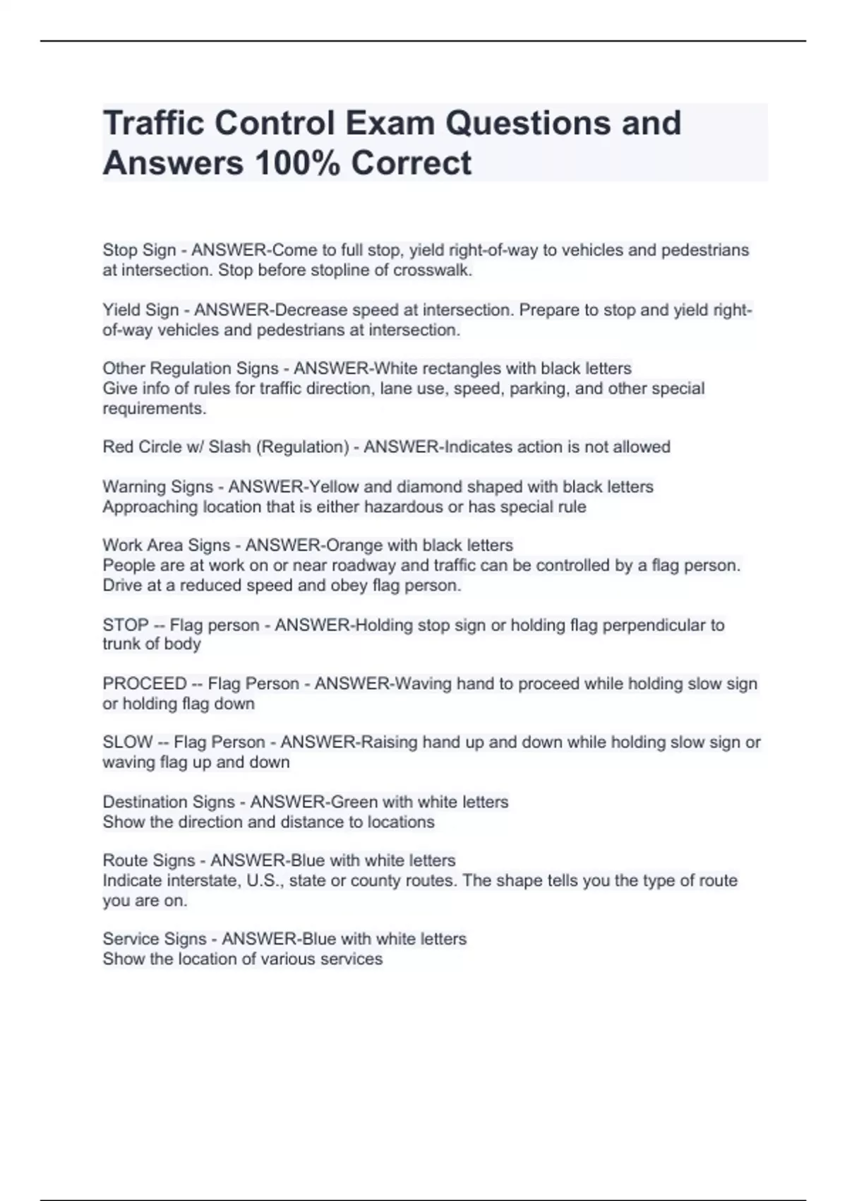 Traffic Control Exam Questions and Answers 100% Correct Traffic Control Exam Questions and Answers 100% Correct Traffic Control Exam Questions and Answers 100% Correct Stop Sign - ANSWER-Come to full stop, yield right-of-way to vehicles and pedestrians at intersection. Stop before stopline of crosswalk. Yield Sign - ANSWER-Decrease speed at intersection. Prepare to stop and yield right-of-way vehicles and pedestrians at intersection. Other Regulation Signs - ANSWER-White rectangles with black letters Give info of rules for traffic direction, lane use, speed, parking, and other special requirements.