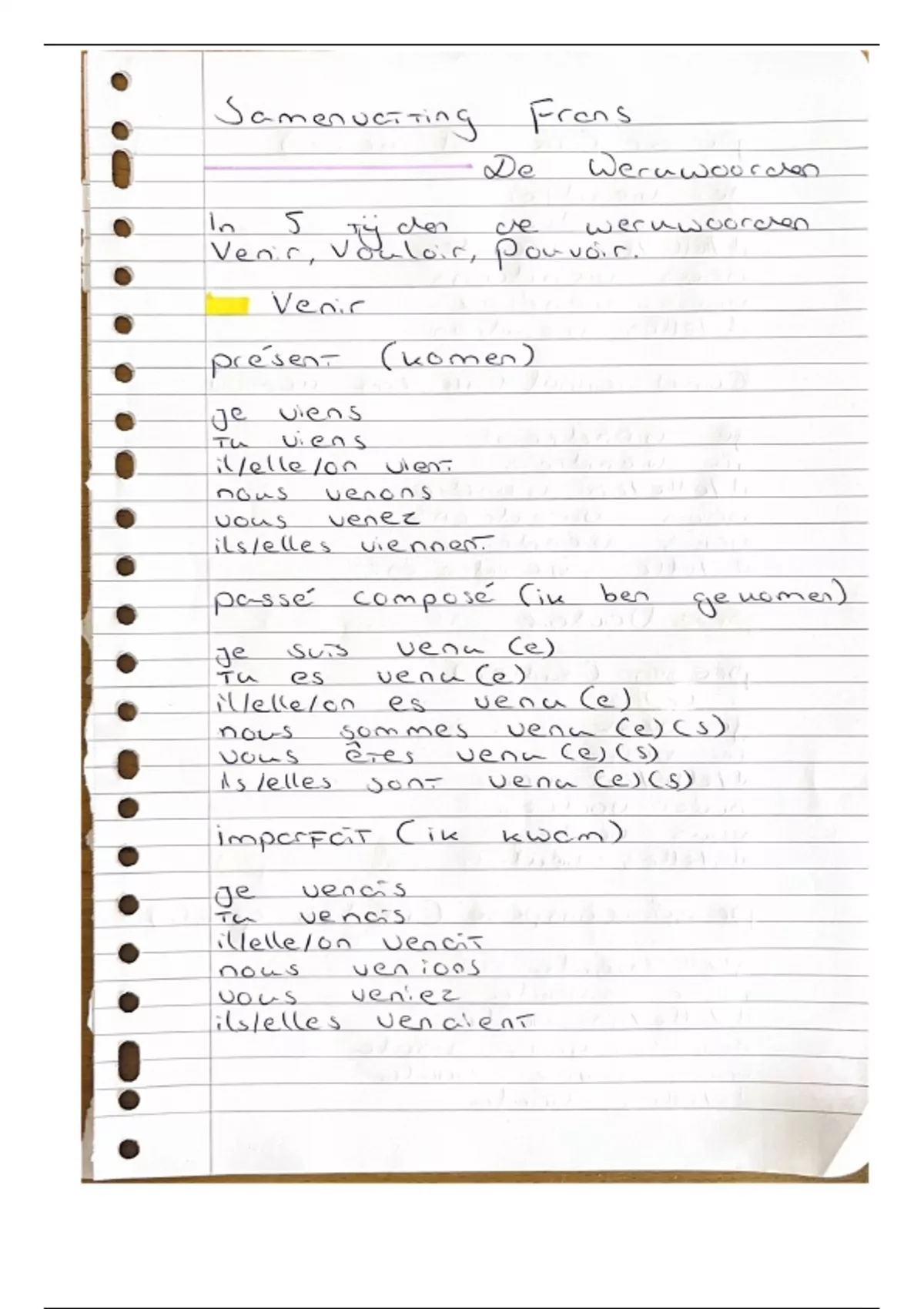Franse Werkwoorden Pouvoir, Vouloir en Venir in 5 tijden uitgewerkt. In deze aantekening heb ik de Franse Werkwoorden Pouvoir, Vouloir en Venir in 5 tijden uitegewerkt. De 5 tijden; Present, Passé Composé, Imparfait, Futur en Conditionnel. Een handige aantekening om te hebben tijdens het leren. #Musthave!