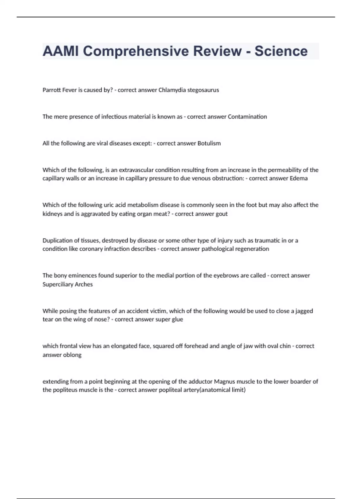 AAMI Comprehensive Review - Science Study Questions 2024.Parrott Fever is caused by? - correct answer Chlamydia stegosaurus The mere presence of infectious material is known as - correct answer Contamination All the following are viral diseases except: - correct answer Botulism Which of the following, is an extravascular condition resulting from an increase in the permeability of the capillary walls or an increase in capillary pressure to due venous obstruction: - correct answer Edema Which of the following uric acid metabolism disease is commonly seen in the foot but may also affect the kidneys and is aggravated by eating organ meat? - correct answer gout Duplication of tissues, destroyed by disease or some other type of injury such as traumatic in or a condition like coronary infraction describes - correct answer pathological regeneration The bony eminences found superior to the medial portion of the eyebrows are called - correct answer Superciliary Arches While posing the features of an accident victim, which of the following would be used to close a jagged tear on the wing of nose? - correct answer super glue which frontal view has an elongated face, squared off forehead and angle of jaw with oval chin - correct answer oblong extending from a point beginning at the opening of the adductor Magnus muscle to the lower boarder of the popliteus muscle is the - correct answer popliteal artery(anatomical limit)