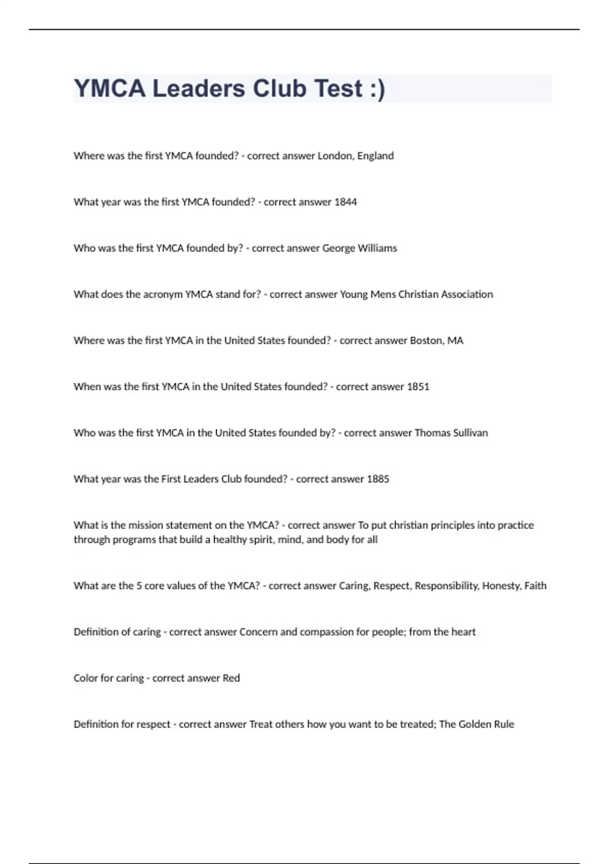 YMCA Leaders Club Test Guide Questions 2024. Where was the first YMCA founded? - correct answer London, England What year was the first YMCA founded? - correct answer 1844 Who was the first YMCA founded by? - correct answer George Williams What does the acronym YMCA stand for? - correct answer Young Mens Christian Association Where was the first YMCA in the United States founded? - correct answer Boston, MA When was the first YMCA in the United States founded? - correct answer 1851 Who was the first YMCA in the United States founded by? - correct answer Thomas Sullivan What year was the First Leaders Club founded? - correct answer 1885 What is the mission statement on the YMCA? - correct answer To put christian principles into practice through programs that build a healthy spirit, mind, and body for all What are the 5 core values of the YMCA? - correct answer Caring, Respect, Responsibility, Honesty, Faith