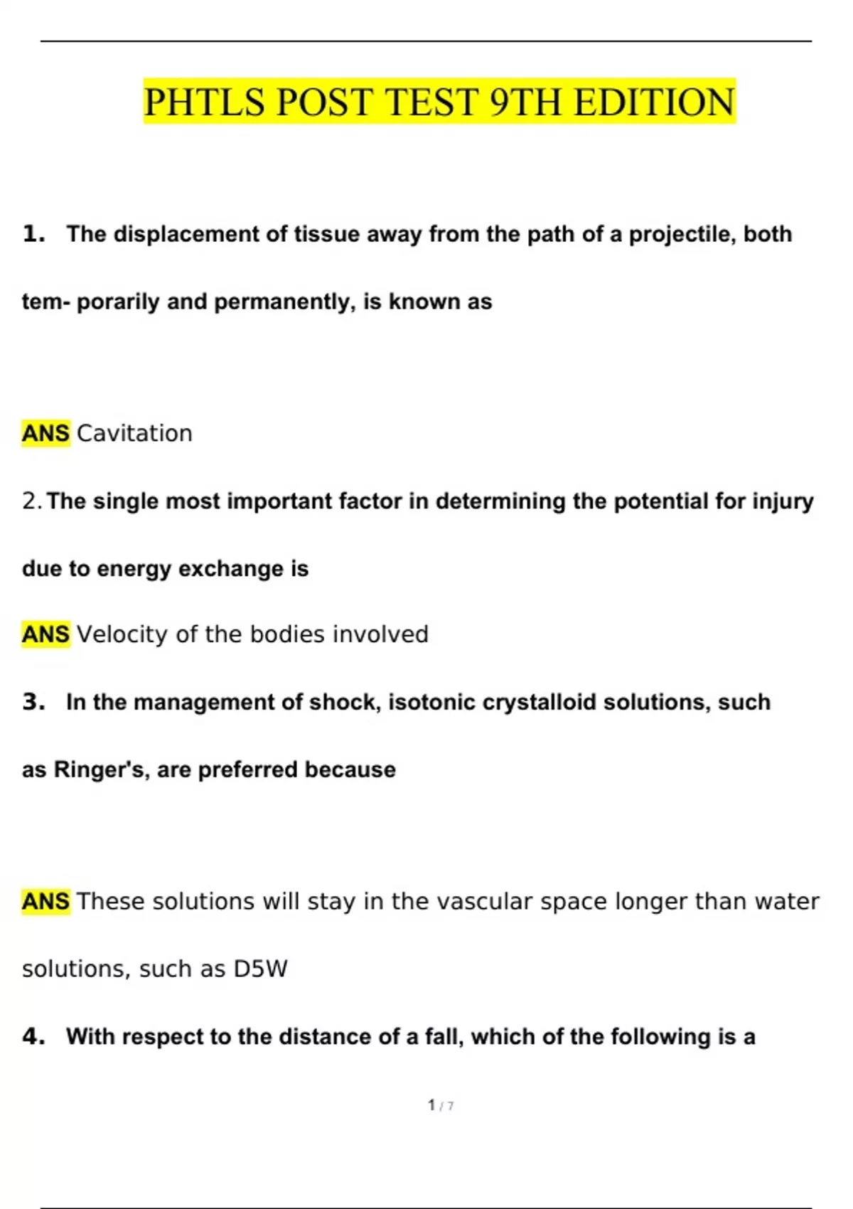 PHTLS Post Test 9th Edition 100% VERIFIED ANSWERS 2024/2025 EXAM